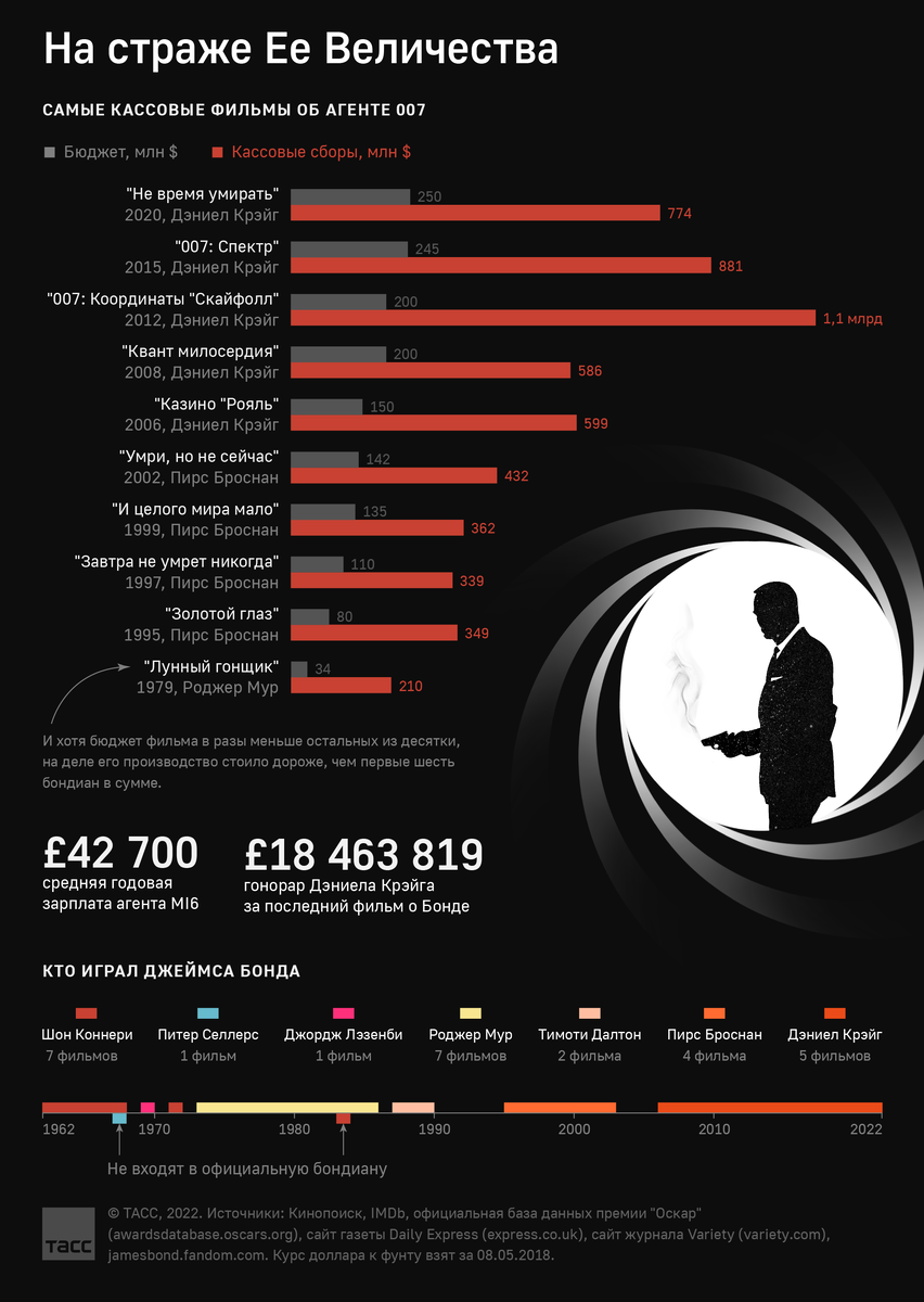 60 лет назад состоялась премьера первого фильма о секретном агенте британской разведки MI6 Джеймсе Бонде. И хотя "Доктор Ноу" собрал меньше других частей бондианы в прокате, в свое время он стал одной из лучших кинокартин года. Относительно небольшие сборы связаны с тем, что в 1962 году кино в принципе было менее доступным, чем сегодня. С момента первой экранизации романа Яна Флеминга вышло еще 26 фильмов, в которых главную роль агента 007 исполнили семь актеров: Шон Коннери, Питер Селлерс, Джордж Лэзенби, Роджер Мур, Тимоти Далтон, Пирс Броснан и Дэниел Крэйг. Спорить о том, кто из них был лучшим Джеймсом Бондом, можно бесконечно. А вот о том, фильмы с чьим участием стали самыми кассовыми, — в инфографике ТАСС.
