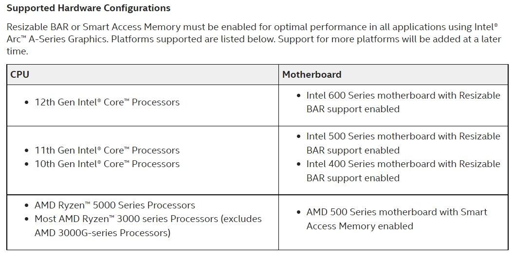 Вместе с этим Intel опубликовала требования к процессорам для нормальной работы грядущих видеокарт Arc, в которых обозначено, что подойдут любые процессоры Intel 10 поколения и новее, а также любые процессоры AMD Ryzen 3000 (кроме серии G, они не на Zen 2) и новее. Обязательным требованием также станут материнские платы Intel с чипсетами 400, 500 и 600 серии с включенной ResizableBAR и AMD 500 серии с активной SAM. Само собой разумеется, что все процессоры и материнские платы, которые вышли после 12 поколения Intel и AMD Ryzen 5000 также будут полностью совместимы с Arc.