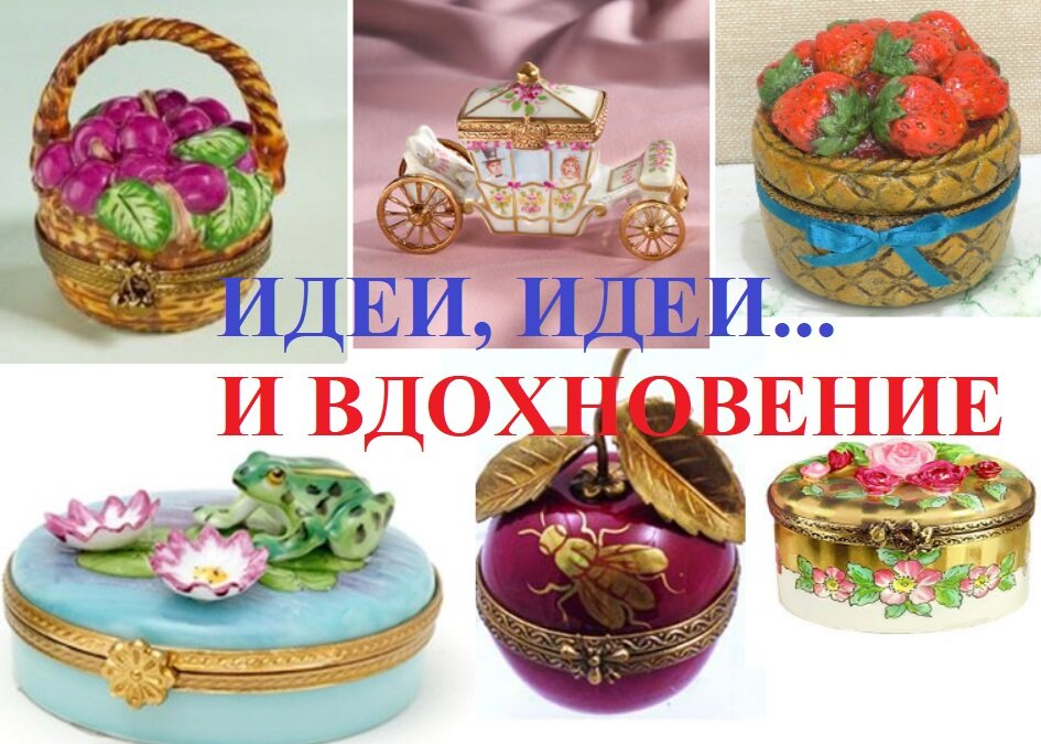Обратите внимание какие объемные интересные шкатулки в виде ягод, фруктов, пирожных, транспорта, коляски с ребенком, домов, и даже городов! Но уже смотрим все это другим творческим взглядом. И если нам захочется, мы тоже можем сделать подобное. Пусть не очень похожее, но свое.