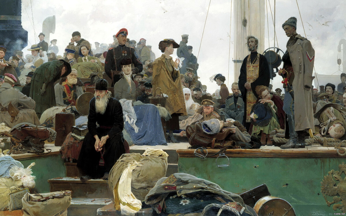 Е. Никифоров: И громадные эпические полотна. То, что сделало тебя знаменитым – «Исход», знаменитое полотно, посвященное исходу русской армии из Севастополя. Громадная красивая картина. Великая по формату, а с другой стороны прописанная акварельно почти, и пока еще не знаменитая картина, которая в скором времени будет выставляться впервые, как я понимаю, это «Парад победы». Невероятная по размеру картина!