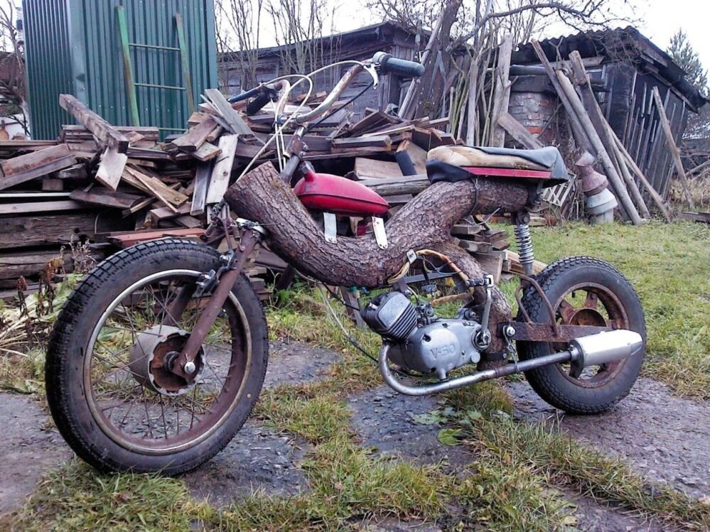 Недавно попалось мне на глаза объявление в местном паблике о продаже мопеда, самодельного, и очень необычного. Самой странной его частью была рама – это в буквальном смысле кусок дерева, какого именно не знаю. То и дуб, то ли яблоня.. Сквозь массив дерева, простите – раму проходит труба, переходящая в самодельную вилку. Амортизаторы у вилки отсутствуют, но опорный подшипник сия конструкция имеет, поэтому «раму» прогрызёт не скоро. Переднее колесо, к слову, оборудовано тормозом велосипедного типа и это единственный тормозной механизм у данного мокика. Задняя подвеска так же сделана из подручного металлолома, но в её конструкции имеется центральный амортизатор, а само колесо – адский набор любых подходящих для него деталей. Оно, кстати, еще и не подшипниках, так что не хухры-мухры. Силовой агрегат V-50 в особом представлении не нуждается, потому что знаком каждому школьнику позднесоветской и постсоветской эпохи. Вся электрическая часть спрятана в дупло, ну то есть технологическую нишу ра