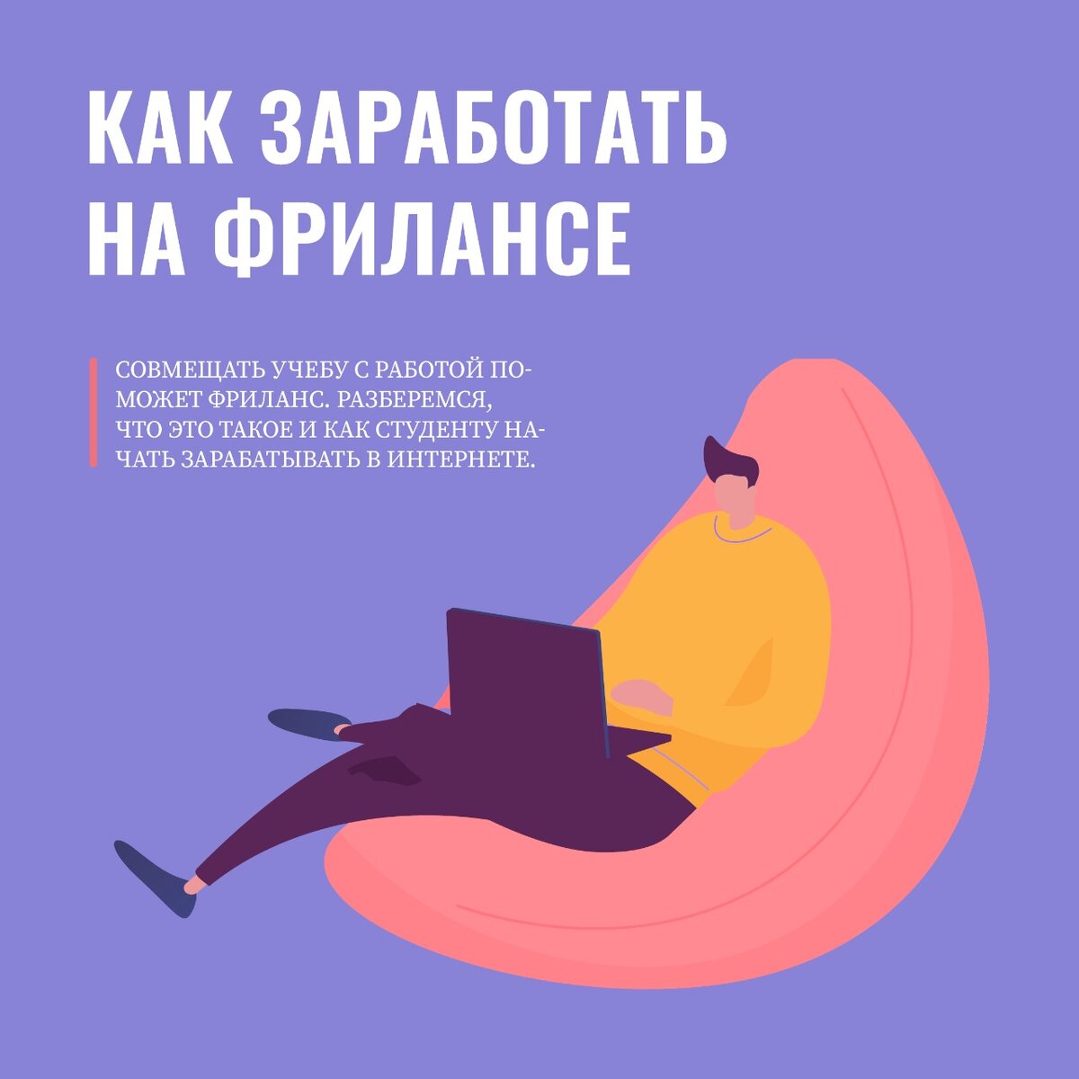 Совмещать учебу с работой поможет фриланс. Разберемся, что это такое и как студенту начать зарабатывать в интернете. Фриланс – это удаленная кратковременная работа, при которой вы не числитесь в штате компании, но выполняете те или иные задачи для нее. Многие могут подумать, что фриланс – это постоянный поиск новых заказчиков, но это отнюдь не так. Большинство фрилансеров предпочитают вести несколько долгосрочных проектов, чем все время искать новые. По сути, фрилансом можно назвать любую работу, которую выполняет наемный работник без официального трудоустройства и удаленно. При высоком профессионализме фриланс может заменить наемную работу, в том числе и по уровню заработка. Областей для работы фрилансером множество. Каждый может найти себе подходящее занятие и проявить свои таланты в любимом деле. Фрилансер может писать музыку для начинающих и профессиональных артистов, составлять договора, заниматься дизайном сайтов, программировать, настраивать рекламу или вести онлайн ур