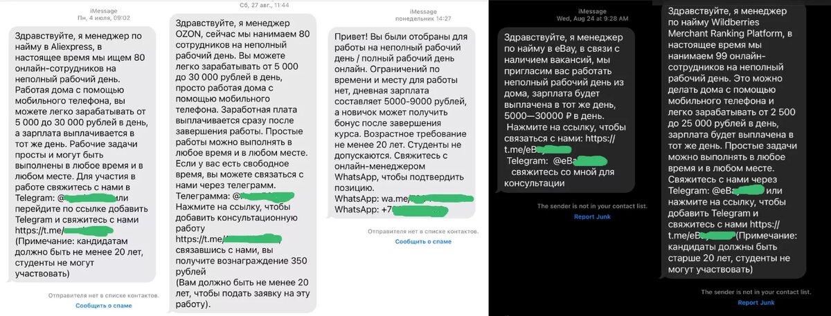 Свежий вид мошенничества — рассылка сообщений о трудоустройстве в известные компании: Wildberries, Ozon, AliExpress, eBay и другие. Сообщения могут начинаться так: «Здравствуйте, я менеджер по подбору персонала Ozon, в связи с наличием вакансий мы пригласим вас на подработку из дома…» или «Привет! Вы были отобраны для работы на неполный рабочий день/полный рабочий день онлайн».
