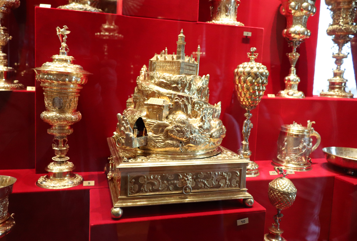 В Оружейной палате есть много занятных и дорогих диковинок, на то она и Оружейная палата. Одни, в принципе можно использовать и сейчас. Например, почему бы не выпить доброго вина из вделанной в кубок чаши большого моллюска наутилуса. Другие же теперь по прямому назначению не используют, принцип и условия жизни поменялись . Поэтому, например, гора-курительница в наше время совершенно не нужна. Ведь зачем их использовали?! Ставится такая махина в зал, где, например, проходит какой-нибудь царский пир. Внутрь заправляются всякие благовония и ставятся ароматические свечи, поджигаются и горят себе потихоньку, распространяя вокруг приятный аромат. Ведь до относительно недавних пор проветривать помещения было не принято. Окна наоборот плотно закрывали. А с тем, что воздух становился при этом спертым и не самым ароматным боролись тем, что окуривали благовониями, например, вот из таких курительниц, сделанных почти из пуда серебра. Сложно сказать, становилось ли от этого на самом деле лучше и