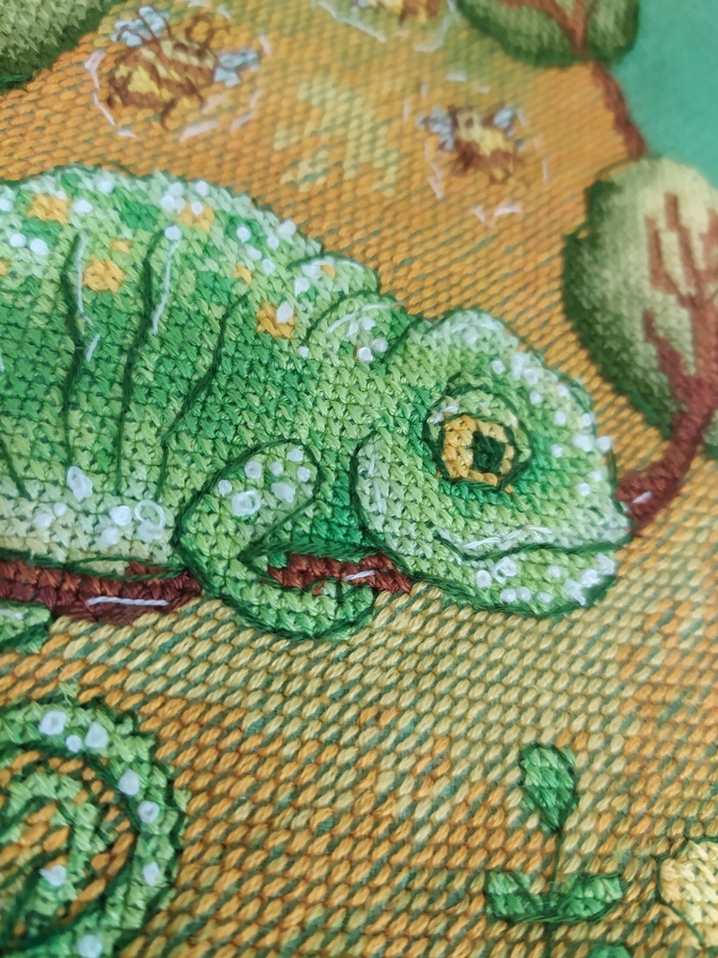 Благодаря бэку и полукрестам - вышивка получилась объемная. Хамелеон, листья, деревья 3D эффектом.