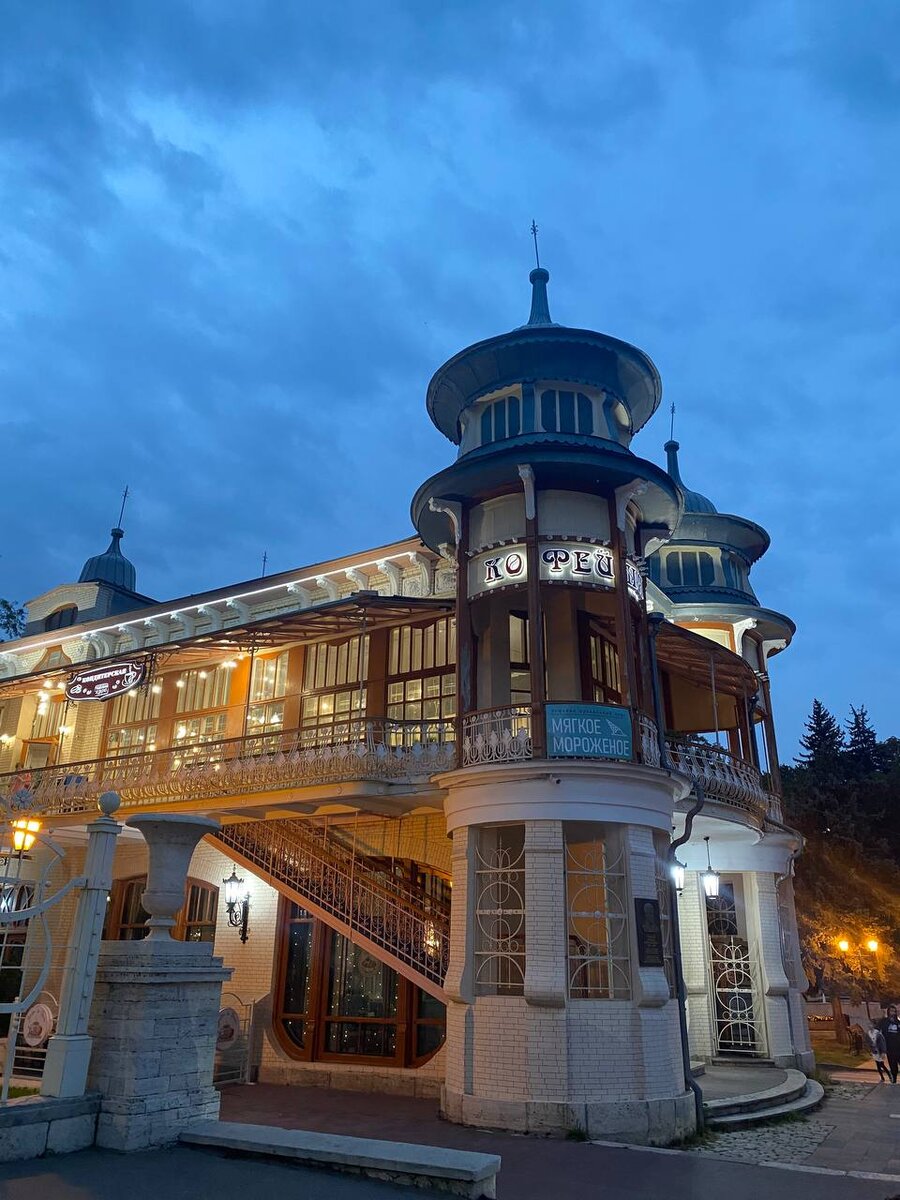 Если Вы уже отдыхали в Пятигорске или только планируете мы хотим Вам рассказать об одном интересном месте,которое очень рекомендуем к посещению. Да, речь пойдет о кофейне Гукасова находящейся в парке "Цветник". Изящная постройка 1909 года и до сих пор является кофейней и мы сегодня туда с вами заглянем. Хотя и принято воспринимать это здание как единую кофейню, но сейчас там функционируют целые две: на первом этаже ретро кофейня стилизованная под старину, а на втором этаже более современная кофейня с открывающимся прекрасным видом с ажурных балконов. Туда мы и направимся. Начиная с подъема по лестнице ты погружаешься в особую атмосферу. Внутри кофейня выглядит достаточно современно, но было сохранено множество старинных элементов, что подчеркивает особенность и историю этого места. Но мы с вами направимся на летнюю веранду, чтобы насладиться теплым вечером и видом на ночной Пятигорск. С первого взгляда кажется,что заведение в историческом здании должно разорить кошелек, но цены здесь