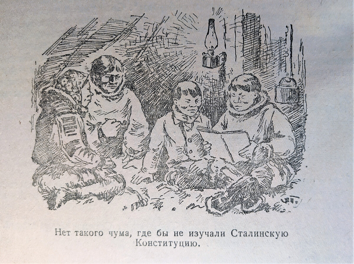 «Все ненцы готовы зорко охранять границы Советского Союза от нападения врагов, — сообщает Егорша. — Нет такого чума, где бы не изучали Сталинскую Конституцию».
