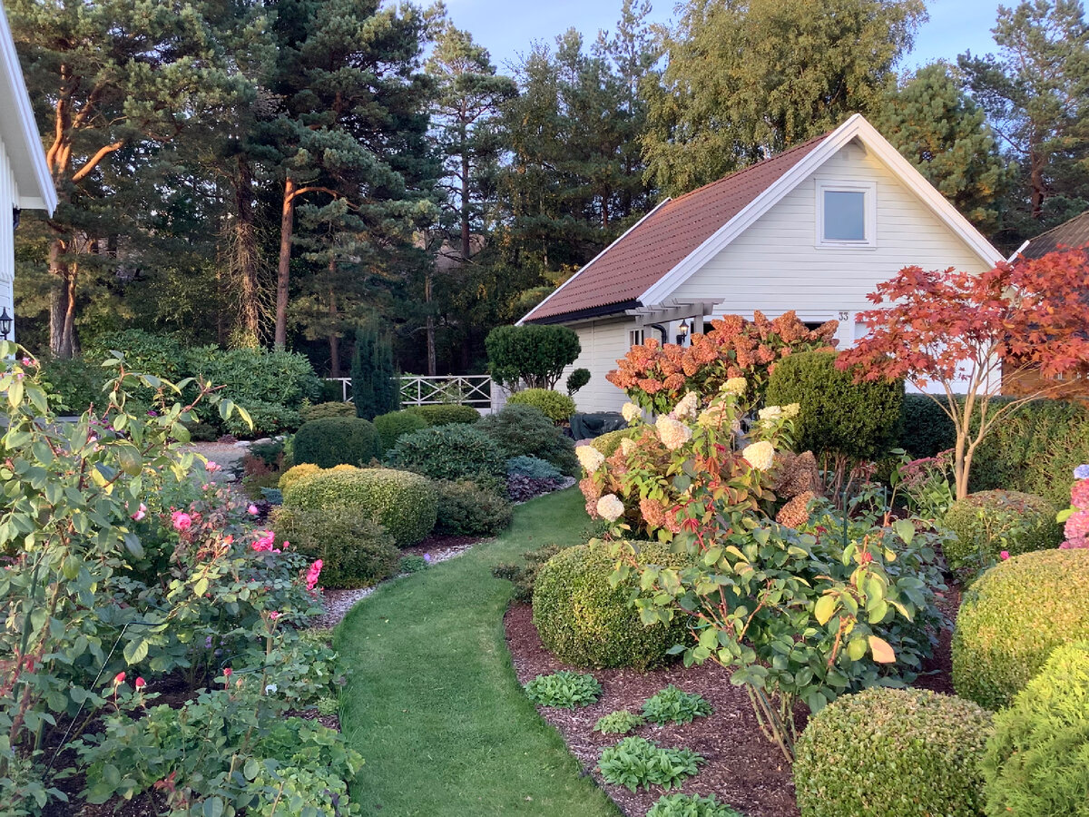Осень продолжает украшать землю, включая и наш сад, как талантливый художник. В разных уголках сада появились отдельные яркие пятна осенних красок… У нас в саду не так много растений, которые уже примерили осеннюю коллекцию от кутюр ( Haute Couture), пока это явно заметно только на листопадных азалиях, хостах и соснах, которые засыпали склон горы и часть территории у дома своей пожелтевшей хвоей. На некоторых метельчатых гортензиях тоже кое-где появились осенние листья. Пока ещё совсем тепло и буквально пару дней назад была почти летняя температура, около +17 С, светило яркое солнце и трудно было поверить, что на календаре начало октября. Пользуясь тёплой погодой погодой, за последние две недели было проделано немало неотложной садовой работы. Еще раньше я писала о пересадке некоторых метельчатых гортензий. Также была посажена ещё одна новая метельчатая гортензия «Pantheon». В конце сентября мы удалили из сада старую крупнолистную гортензию, заменив ее на новую сорта «Together». Все ве