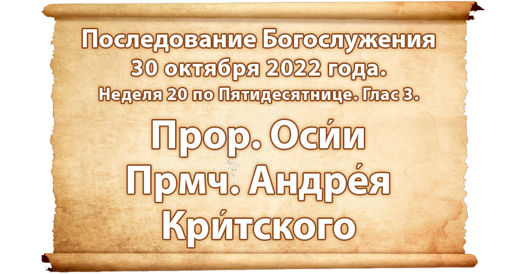 По ссылке на страницу последования богослужения можно скачать в разных форматах службу 30 октября 2022 года. Неделя 20 по Пятидесятнице. Прор. Осии. Прмч. Андрея Критского. Глас 3. Прямая ссылка на полное последование богослужения 30 октября 2022 на резервной странице. Резервная страница проекта: https://posledovanie.my1.ru/index/0-2