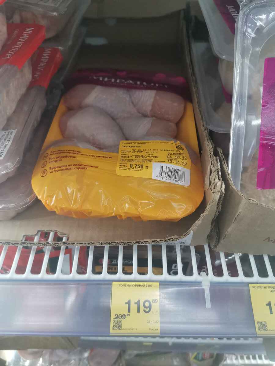 И тут такой сюрприз. "Мираторг" меня устраивает, я покупаю у них и полуфабрикаты, и мясные изделия, а сейчас ещё и щедрая скидка действует. Упаковку охлажденной курицы, которая весит 750 гр, можно купить всего за 119 рублей вместо 209. Мне прямо-таки очень подошло, ибо я как раз приготовила всю пачку и этого хватит минимум на 2, а скорее всего и на 3 дня. Было бы ещё несколько упаковок в наличии, забрала бы все, курица хорошая, без лишних запахов или жидкости при готовке.