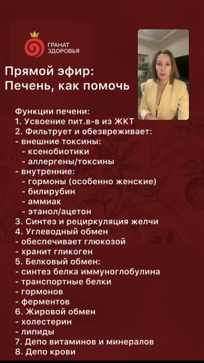 Печень - молчаливый труженик нашего организма. Ей приходится отловить и обезвредить не только внешние токсины, но ещё и наши собственные, образовавшиеся в процессе жизни. При этом на вопрос, доктор, а что делать с жировым гепатозом, пациент слышит типа «забей». При том, что это гибель клеток и замещение жиром, в рабочем состоянии осталась половина печени. О функциях печени, о заболеваниях, которые возникают при нарушении этих функций и как это исправить рассказываю в прямом эфире: Какие из последействий нарушения работы печени вы у себя обнаружили? Какие действия для себя наметили? #печень #заболеванияпечени #гепатоз #токсины #доктор гульнара мазитова Анонс курса «Гранат Здоровья» Отеки: причины Высокий холестерин: что делать?