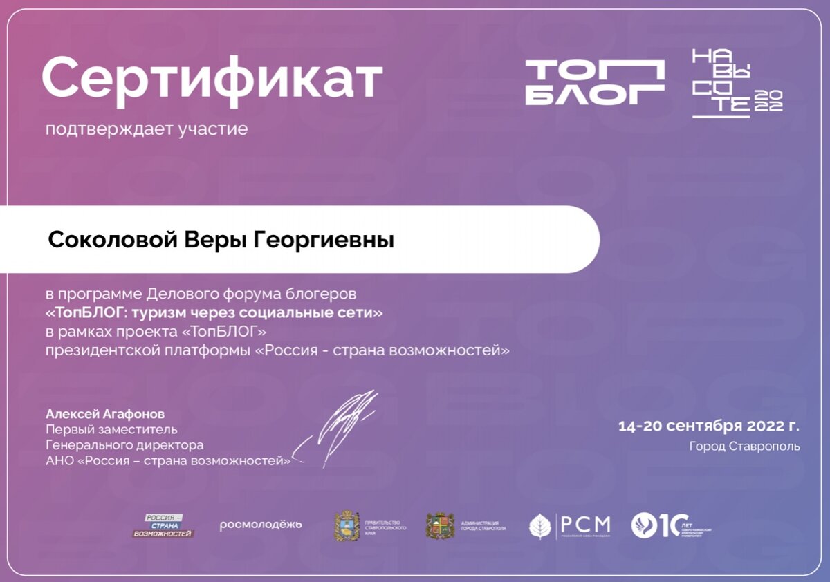 Сегодня мне пришёл сертификат от ТопБЛОГ за мою поездку в Ставрополь!) Спешу поделиться!