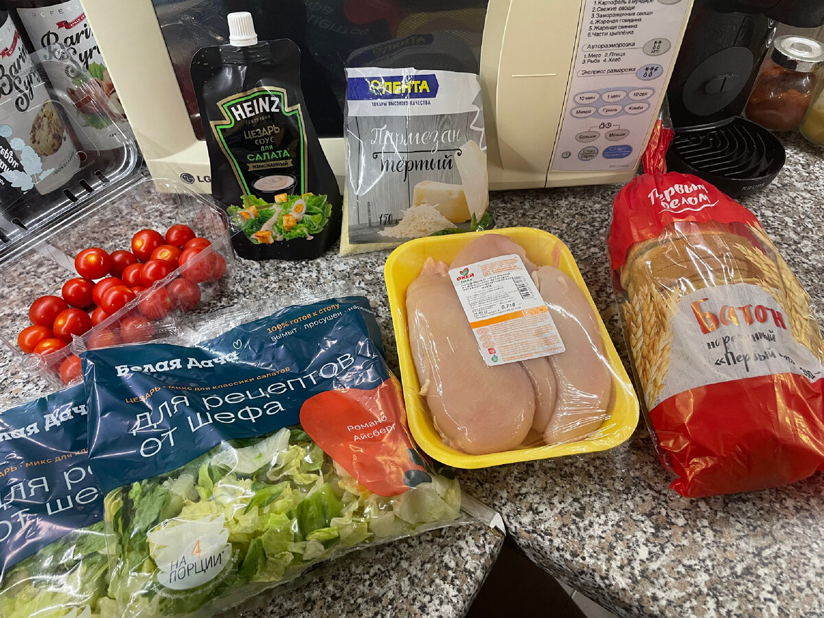 Это один из моих самых любимых салатов, но почему-то я никогда сама его не готовила. Пришло время ;) Понадобится: Курицу режем плоскими ломтиками, смешиваем с любимыми специями и солью. Обжариваем на растительном масле с двух сторон до золотистой корочки и оставляем в сторону. В том же масле обжариваем на среднем огне нарезанные кубиком кусочки хлеба, помешивая, минуты 3, так же до золотистой корочки. В миску кладём листья салата Следом добавляем к листьям курицу Добавляем соус и перемешиваем Сверху добавляем помидоры и сухарики Посыпаем тертым сыром и невероятно вкусный салат готов. Конечно, можно сделать этот салат более бюджетным, заменив черри на обычные томаты, пармезан на российский, а листья салата на какую-нибудь пекинскую капусту. Но благодаря выбору именно этих продуктов получается неповторимый вкус того самого Цезаря. Кстати, тертый пармезан гораздо дешевле цельного куска сыра ;) В следующий раз попробую сама сделать соус, пока так) Приятного аппетита 😋