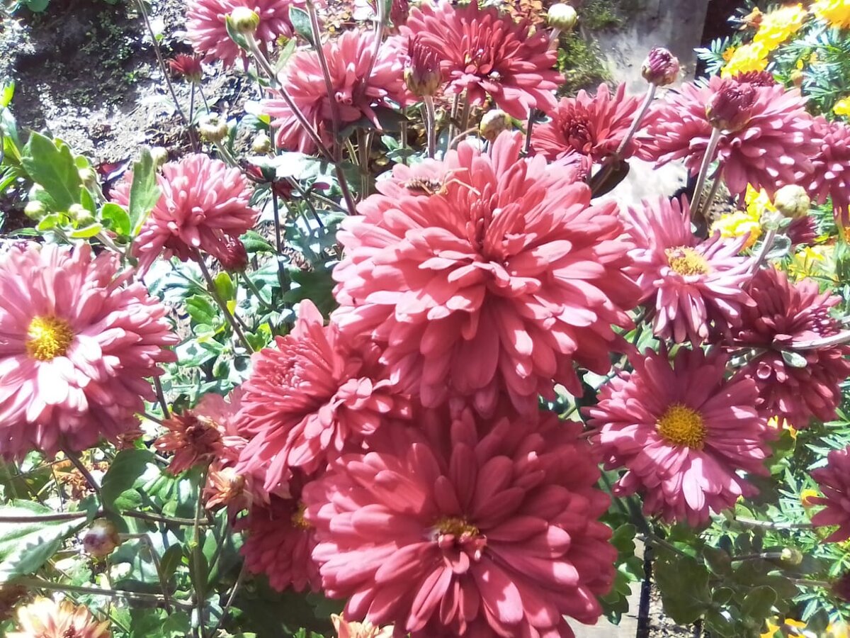 Всем доброго времени суток! Время неумолимо двигается вперёд. Вот уж и сентябрь закончил свой стремительный бег. Дождались и октября. Время цветения многолетних вроде и продолжается, но кое- где уж и листочки подвяли, и цветочки от дождей потеряли свою былую красоту... Хризантемы только краше стали осенью. Из разную окраску сложно передать словами. Это нужно видеть!!! Ни один цветник не обходится без этих изумительных бархатцев. Я просто влюблена в них). Пиретрум, или персидская ромашка, как растение называют в природе – нечастый гость на наших приусадебных участках. Многолетник не удивляет экзотическим цветением или необычной зеленью, его красота, скорее, скромна. А мне она очень нравится... А этот цветочек я даже не знаю, как называется... Может, подскажете? Осень! Побудь ещё тепленькой, подари нам ласковые ДЕНЁЧКИ!!! Ведь зимой мы ещё успеем померзнуть))