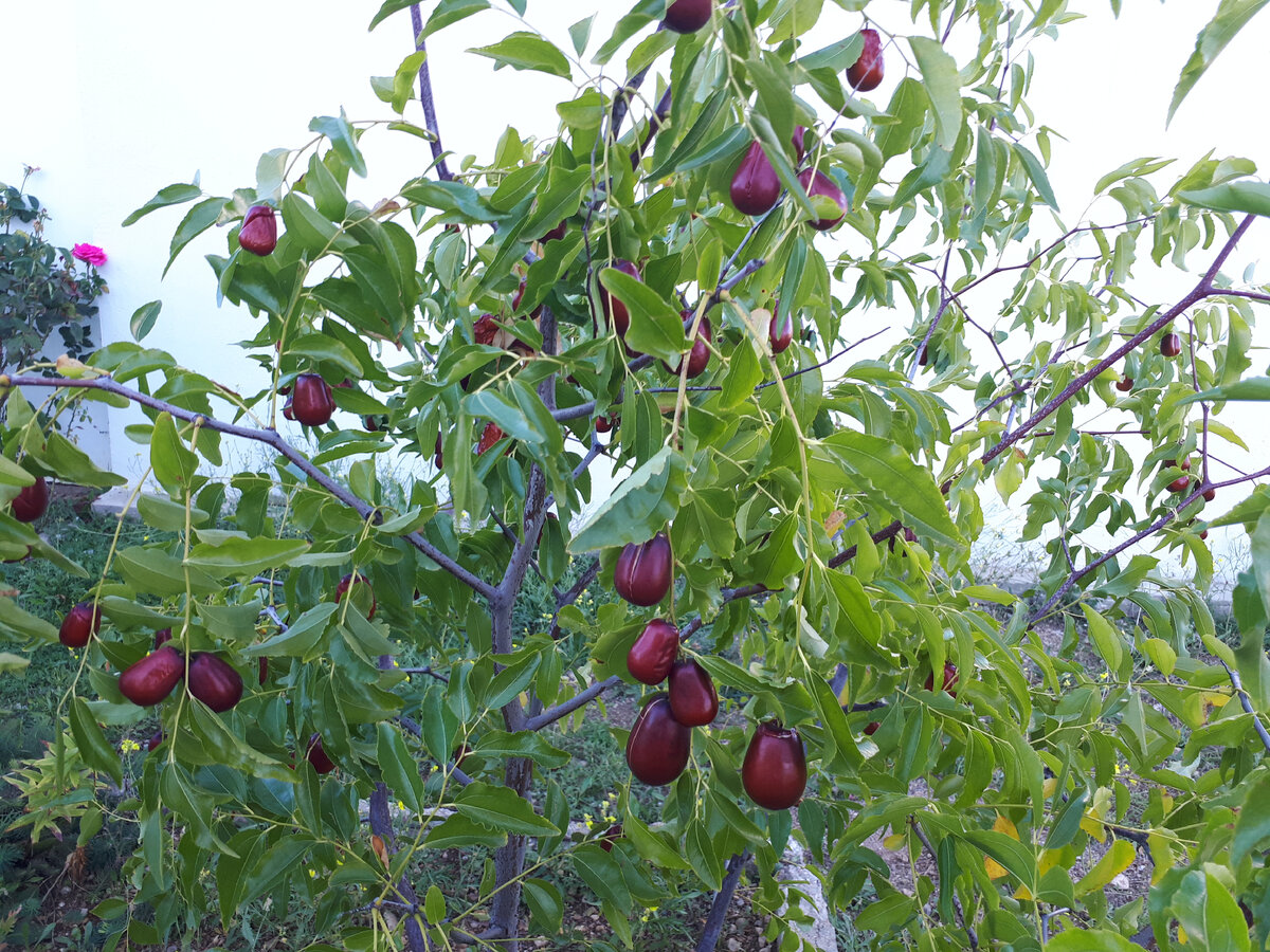 О таком "звере" как зизифус я впервые узнала именно после того, как мы купили участок в Крыму. Мы тогда ещё не переехали в Крым совсем, а мотались туда-сюда. Муж осенью в очередной раз поехал в Крым, так как стройка шла полным ходом. И заодно решили, что пора начинать закладывать сад. Хотели посадить персик, черешню, яблоню. Ни о каком зизифусе и речи не было, просто о нем мы не знали. Когда муж пошёл приобретать саженцы ему и предложили куст зизифуса. Сказали, что плоды очень полезны и хорошо помогают от давления. Вот и решили посадить. Растение неприхотливое, растёт быстро. Очень интересно, что цветёт оно летом, а плоды поспевают в конце сентября, начале октября. Плоды коричневого цвета, такие продолговатые в форме маленьких груш. А на вкус как сладкие, мягкие яблочки. Вообще вкусные. Косточка длинненькая, тоненькая. Первые плоды появились уже на следующий год, и куст разрастался очень быстро. Сначала я не знала вообще, что с ними делать. А так как и было их не так уж много, они прос