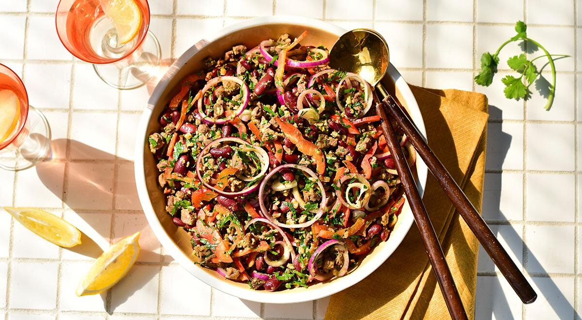 Салат с говядиной и грецкими орехами – беспроигрышный вариант на любой праздник. Его оценит все без исключения гости. Мужчинам он понравится своим составом. Здесь все самое сытное: вареная говядина и консервированная фасоль. А за свежий вкус отвечает сочный болгарский перец. По душе представителям сильного пола и пикантный, острый вкус блюда, который обеспечивает чеснок и красный острый перец. Если не любите острое, перец можно не добавлять. Но чеснок обаятельно положите. Без него будет слишком пресно. Женщины же ценят этот салат за отсутствие майонеза. Блюдо мы польем легкой заправкой из оливкового масла и лимонного сока. Такой салат надолго насытит и не оставит чувство тяжести. ИНГРЕДИЕНТЫ Для заправки: ПОШАГОВЫЙ РЕЦЕПТ ПРИГОТОВЛЕНИЯ Шаг 1 Приготовьте мясо для салата с говядиной и грецкими орехами. Мякоть говядины промойте, выложите в кастрюлю и залейте водой. Доедите до кипения, а затем варите на медленном огне до готовности (около 1-1,5 часа). Посолите по вкусу. Шаг 2 Мясо выньте и