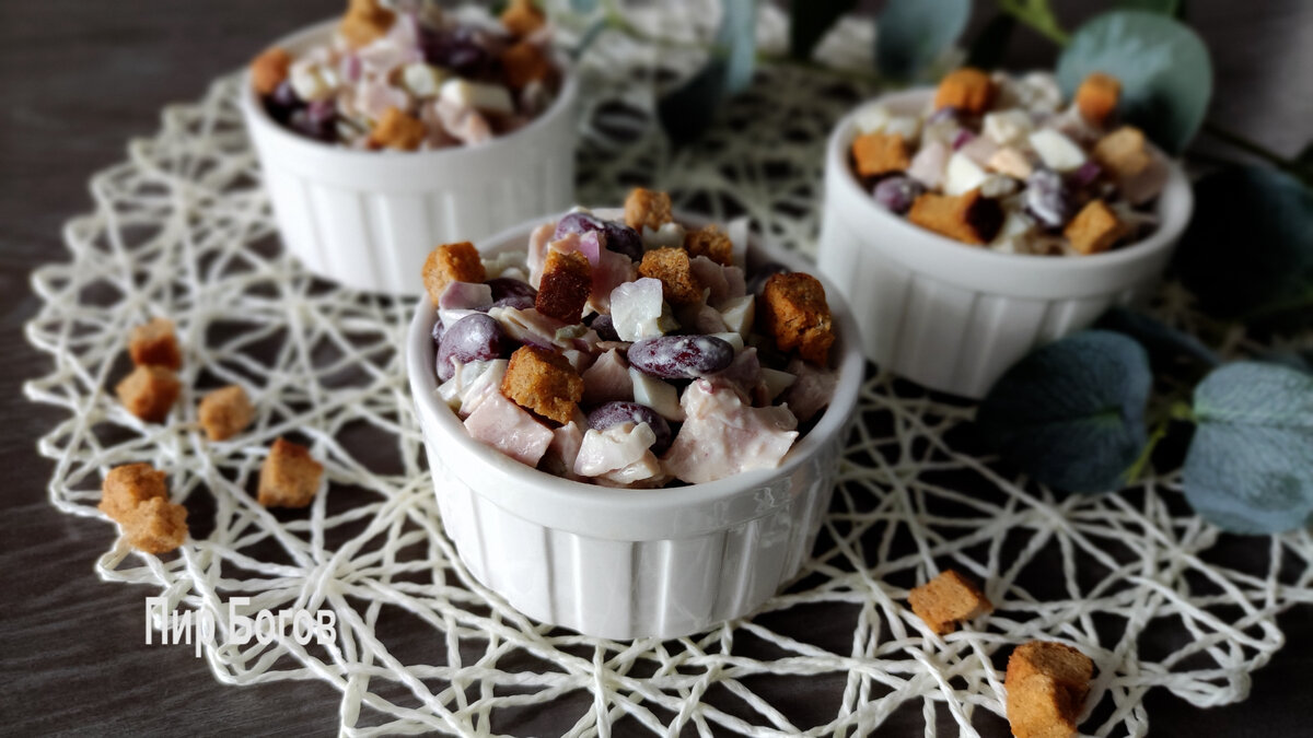 Сегодня у нас красивый и сытный салат, который можно приготовить на праздничный стол и просто для семейного ужина. Особенно радует, что он готовится за считанные минуты. *** Подробный рецепт можно увидеть в видео на моем канале здесь или на канале YouTube Пир Богов вот здесь 🥘🧆🥗. Еще там есть много вкусных рецептов. 🥧🍹Подписывайтесь))) 😉 🤗А это мы в VK: https://vk.com/pir.bogov *** Состав: 1 маленькая баночка фасоли 200гр копченой курицы 2 яйца ½ фиолетовой луковицы 2 соленых/маринованных огурца Майонез/сметана Сухарики для подачи Способ приготовления: Два вареных яйца нарезаем крупными кусочками. Так как салат не выкладывается слоями, то все подготовленные ингредиенты сразу кладем в чашу для смешивания. Фиолетовую луковицу нарезаем средними кусочками. Копченую курочку (грудку или мясо с окорочка) нарезаем маленькими кубиками. Соленые или маринованные огурцы нарезаем маленькими кубиками. Хорошо подходят острые огурцы с небольшой кислинкой. Консервированную фасоль промываем прох
