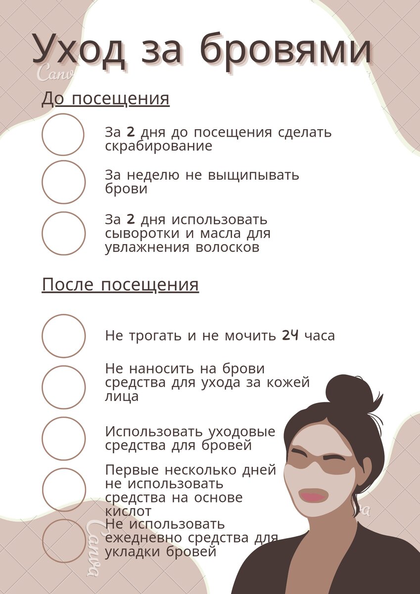 Стрижки, окрашивания волос, салонные уходы и различные восстановительные процедуры для волос - все это основные услуги, которые я предлагаю саоим клиентам. Но на этом я не остановилась, изучила и успешно практикую окрашивание бровей и ресниц, корректировка формы и, конечно же, правильный уход за ними. Здесь я хочу оставить памятку по уходу за бровями "до" и "после" процедуры. Это позволит сохранить ваши брови в форме как можно дольше. Я не претендую на звание бровиста года, но ничего не может мне помешать стремиться к идеалу, пополняя свои познания и практику в создании правильной формы и цвета бровей. И так, рекомендации следующие: До посещения мастера: После процедуры: Красоты и здоровья вам!