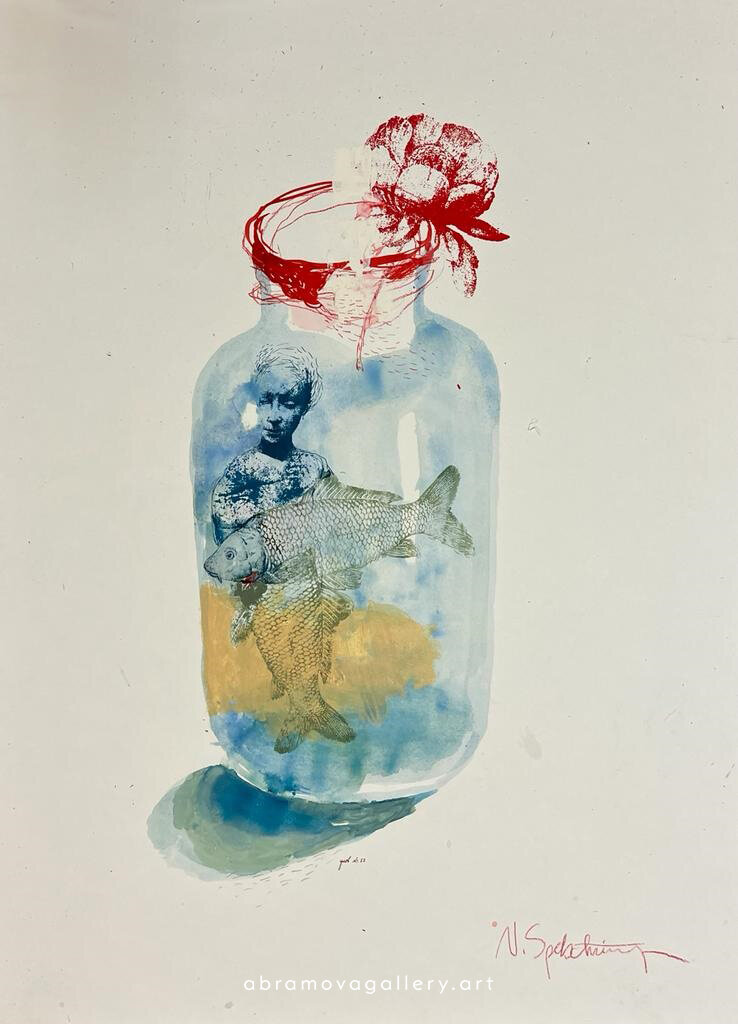В графической серии «Рыба для кошки или Улов №…» импровизированные аквариумы наполнены «странными предметами, словно наши головы мыслями, не всегда логичными, не всегда понятными даже самим себе, и выбраться оттуда им непросто…» — рассказывает художница Наталия Спечинская. Здесь собраны самые разные артефакты: от классических образцов искусства до редких или курьёзных вещей. Кузнечики, стрекозы, русалки или старинные статуэтки наполняют хрупкие оболочки банок и бутылок, словно витрины антропологического музея. Наблюдая за повседневными занятиями людей и помещая их «под стекло», Наталия Спечинская, как настоящий антрополог, рассматривает их как удивительные феномены времени. Внимательно исследуя эти необычные сочетания вещей, художница производит рефлексию над символическим содержанием стеклянных аквариумов. Заигрывая с нашим воображением, она предлагает зрителям погрузиться в эфемерный мир фантазий, где обретают плотность хрупкие материи идей. Работы Наталии Спечинской находятся в час