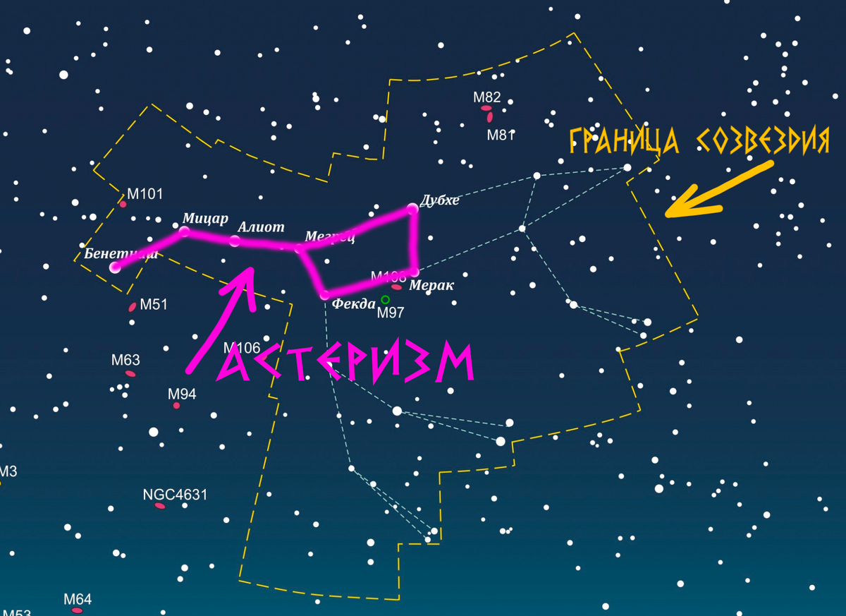 Давайте с вами разберёмся, что такое созвездие и астеризм. Также как и земля разделена на различные государства, небесная сфера для удобства ориентирования разграничена астрономами на участки. Звёзды каждого участка приписываются к созвездию, находящемуся в нём. Например, всем известный астеризм Большой ковш в созвездии Большой Медведицы образуют семь самых ярких звёзд в этом созвездии. Суть в том, что астеризм - это лишь группа звёзд формирующая запоминающийся рисунок на небе, но это ещё далеко не всё созвездие. В созвездии Большой Медведицы астрономы насчитывают 224 звезды! Также стоит добавить, что такие понятия как астеризм и созвездие не означают, что все звёзды, находящиеся в них, физически расположены близко друг к другу. В действительности они находятся на невообразимо огромных расстояниях друг от друга, достигающих порой тысяч, а то и десятков тысяч световых лет. Для понимания, - световой год - это единица измерения расстояния, а не времени, как думают некоторые; равен он