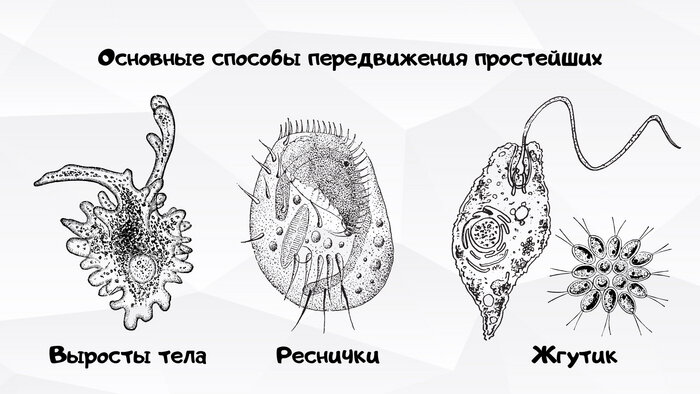 1) С помощью выростов тела; 2) С помощью коротких, но многочисленных ресничек; 3) C помощью длинных жгутиков;