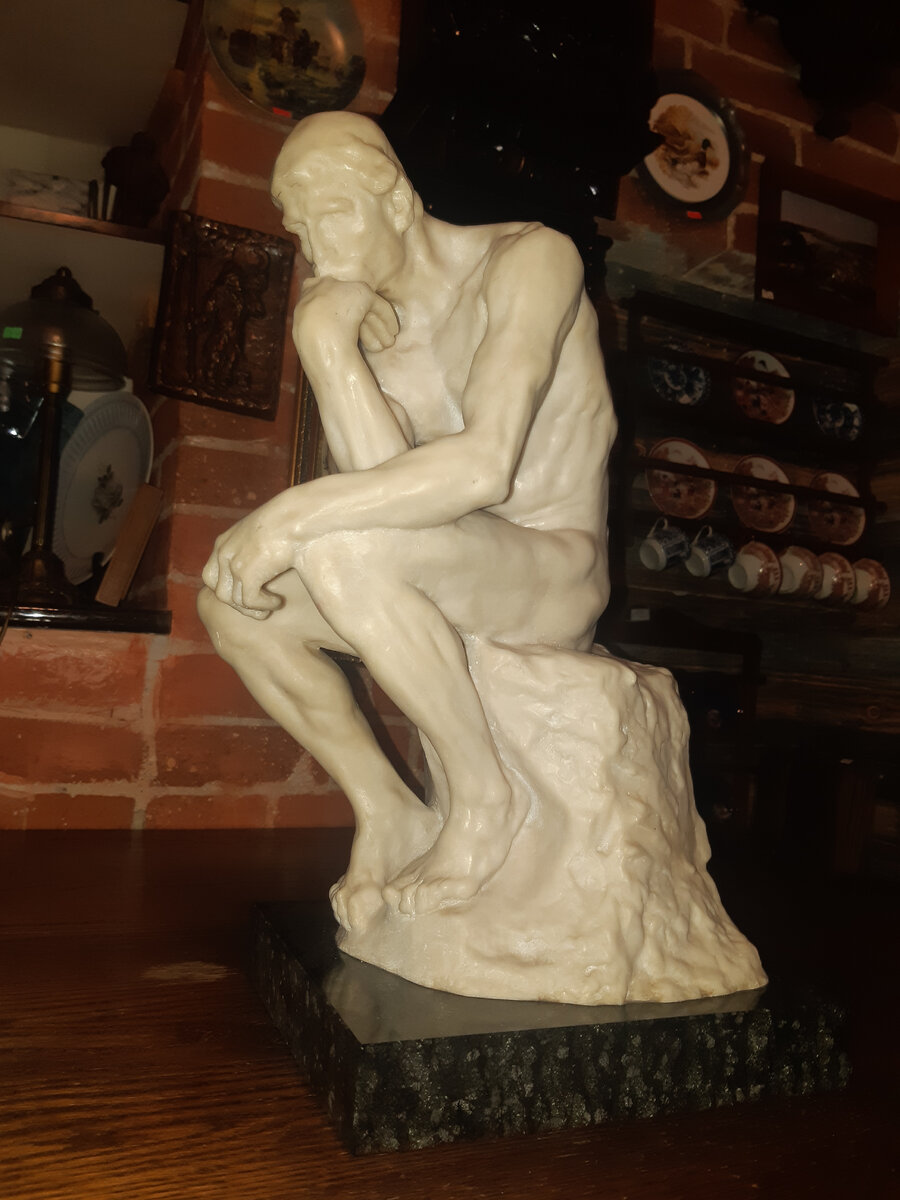 Эта всемирно известная работа, несомненно, является одной из вершин искусства Родена. Она была создана не как отдельная фигура, а как часть монументальных ворот, известных как Врата Ада, которые государство заказало для него в 1880 году для будущего Музея декоративного искусства в Париже и которые были отлиты только после ее смерти. Мыслитель возвышается над Вратами Ада, где он олицетворяет Данте, итальянского поэта, автора "Божественной комедии", Врата ада которого являются лишь частичной иллюстрацией. Роден быстро придает произведению более общий смысл, излагая его изолированно и реализуя в различных измерениях, вплоть до монументальных размеров. В этой фигуре чувствуется влияние скульптуры итальянского Возрождения и особенно Микеланджело, которому также обязаны некоторые шедевры XIX века, такие как Уголен де Карпо, копия которого принадлежала Родену. Его мощная Анатомия отражает настолько интенсивную внутреннюю концентрацию, что произведение стало универсальным символом человечес