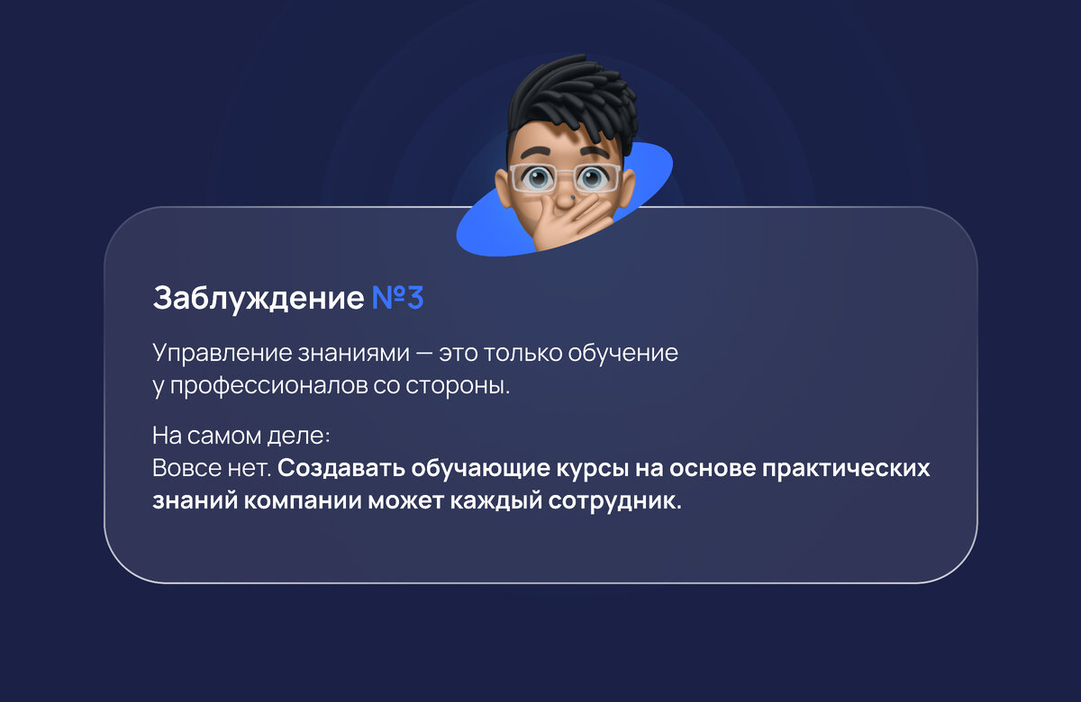 Управление знаниями — это только обучение у профессионалов со стороны. Вовсе нет. Обучение — всего лишь один из способов передать готовое знание. Этим занимаются обучающие платформы, где опытом делятся сторонние эксперты: Skillbox, Otus, GeekBrains. Даже если вы заплатите за обучение сотрудников, вы все равно не сможете управлять этими знаниями. Во-первых, у обучающих платформ массовые курсы, они не учитывают потребности конкретной компании. Например, в курсе “Проджект-менеджмент” нет блока о том, как в конкретной компании принято общаться с клиентами. Вам все равно придется адаптировать содержание курса со стороны под себя. Во-вторых, эти знания остаются в голове сотрудника. Если он уволится, то заберет их с собой. Обучение у сторонних экспертов — не управление знаниями. Эти знания не принадлежат компании. В управлении знаниями создавать курсы может любой сотрудник. Не обязательно ведущий эксперт. Материалы для курсов полностью берутся из реального опыта компании. Например, дизайнер с