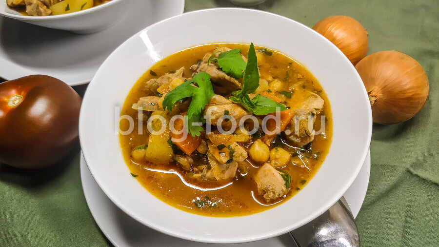 Всем привет. Сегодня приготовим очень ароматную, вкусную и сытную штуку в среднеазиатском стиле. Шефмаркет обозвал его «Нохад Шурак», однако, на реальный узбекский суп-рагу из баранины это блюдо похоже очень мало. Поэтому не будем провоцировать кулинарных перфекционистов и назовём этот рецепт просто «Рагу из курицы с картошкой и нутом». Тут у нас курица, маринованная в чесноке, масле и паприке, но можно не заморачиваться и использовать обычную — просто порубите пару зубцов чеснока и добавьте в рагу. Продуктовый набор: Курицу, картошку и морковь режем небольшими кусочками, лук полукольцами, кинзу со стеблями и листья базилика рубим мелко, оставив немного на подачу. В сотейнике разогреваем немного растительного масла и обжариваем курицу на сильном огне в течение двух минут. Перекладываем в миску. На место курицы кладём картошку, добавляем немного масла, обжариваем две минуты. Добавляем лук, морковь, жарим три минуты, периодически помешивая. Добавляем томаты, хмели-сунели, кориандр, 300 м