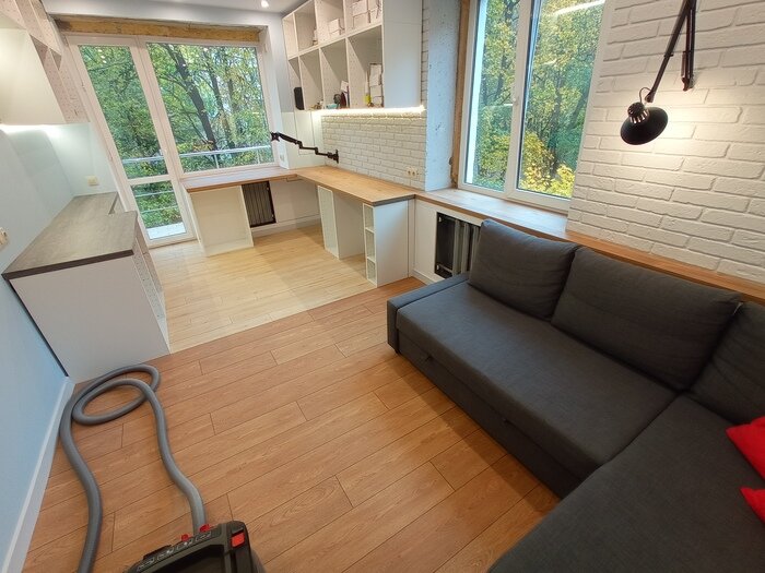 Давайте рассмотрим проект. Функционально, помещение разбито на 2 зоны - Гостиную и Рабочую зоны. Разделение реализовано почти сугубо декоративными методами - никаких перегородок или ширм - только цвет пола и обрыв рабочих шкафов. Места мало, любые перегородки превратили бы помещение в каморку. Гостиная зона простая - в ней есть большой угловой диван (2.4 метра), который одновременно и место отдыха, и гостевое спальное место - так как диван раскладывается в большую двуспальную кровать. На стене над диваном 2 сегментарных светильника - имеют как декоративную цель, так и рабочую - их можно использовать для чтения или как ночник. Напротив дивана - телевизор. Стена с телевизором предполагает быть "зеленой" при помощи ампельно закрепленного остролиста. Также предполагается 1-2 мешка, как дополнительные места для отдыха.