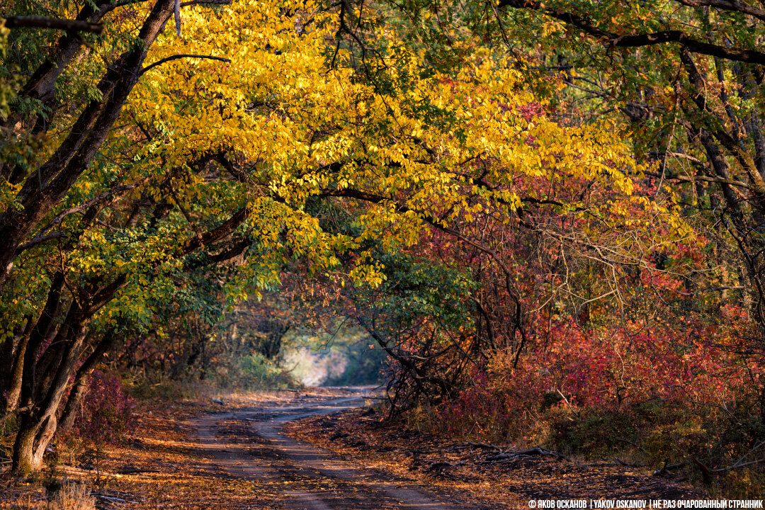 У нас, на юге Ростовской области с лесами туго. Степной сухой климат и глубоко залегающие водоносные слои не дают вырасти полноценному лесу самостоятельно. Тем не менее, несколько лесов у нас на юге области есть. Один из них, Александровский, был посажен людьми, которые ухаживали за лесом, поливая деревья, давая им укрепиться, и дорасти корнями до воды. Лес этот мало похож на леса центральной полосы России, и ещё меньше похож на нашу северную тайгу. Скорее он напоминает сухие тропические леса Раджастана в Индии. Для сравнения приведу фото ниже. И тем интереснее по нему погулять и изучить природу этого необычного леса, тем более, что доподлино известно, что о отличие от Раджастана, тигры тут не водятся и можно ходить не опасаясь быть съеденым :) Октябрь только-только начал переодевать лес в осенний наряд, тут и там расцвечивая окружающие деревья и кустарники в жёлтое и красное. Денёк выдался жаркий, и у воды возле речке кружили стрекозы-метальщицы, самцы которых окращены в ярко-красный