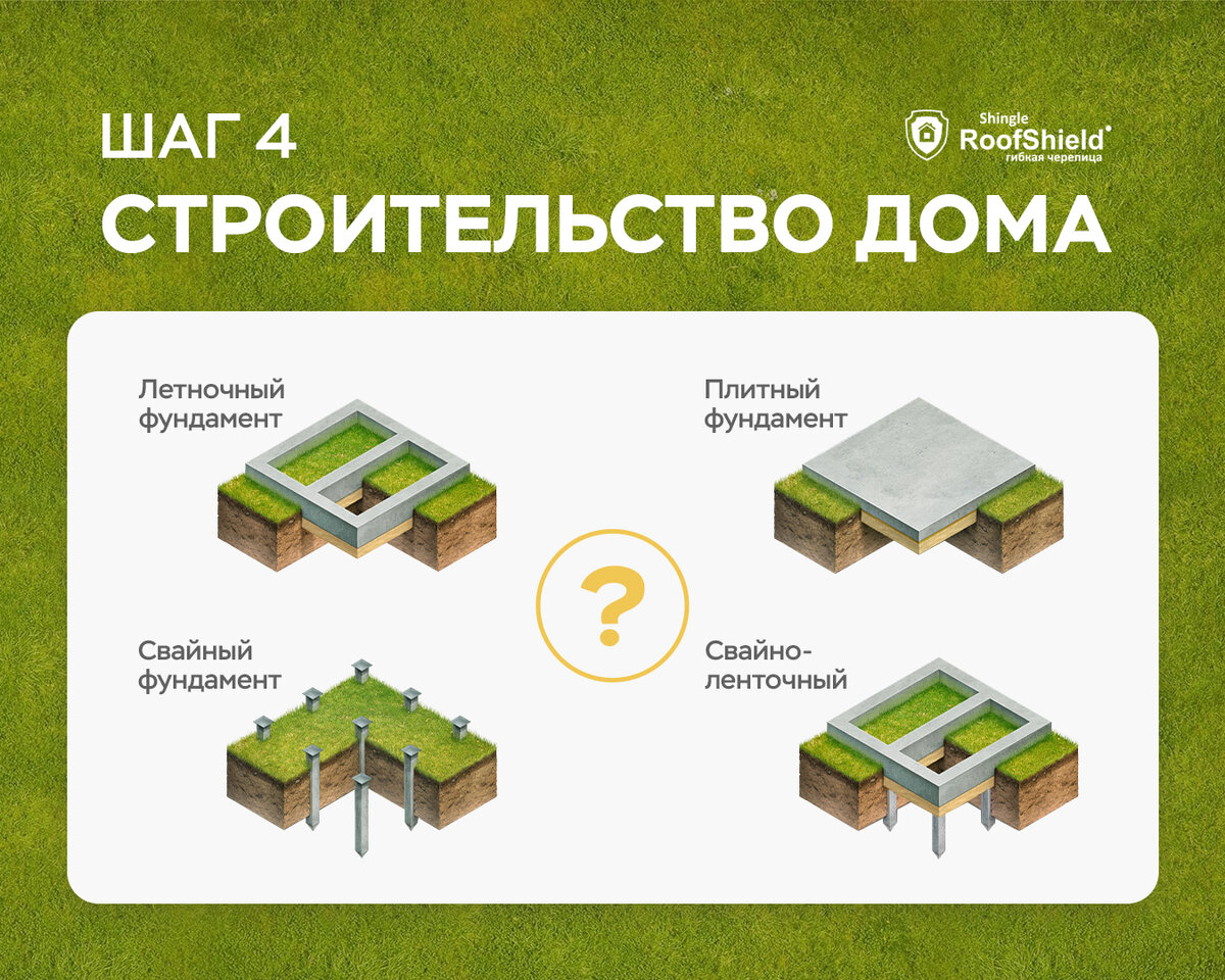 Участок для будущего дома распланирован. Тут у нас будет банька, а там раскинется сад-огород… Стоп! Далеко в мечты не уходим, впереди ещё много работы — пора определиться с типом фундамента. Самый популярный тип фундамента — ленточный. Он достаточно универсальный. Не пойдёт только тем, кто решил построить дом на болоте или в вечной мерзлоте… Такой фундамент повторяет контур здания и располагается под наружными и несущими стенами. Тут есть где разгуляться, можно оборудовать подвал или цокольный этаж. Если на вашем участке слабый грунт — поприветствуйте плиточный фундамент. В таком случае на землю укладывается цельная армированная плита, которая служит и фундаментом, и основой для пола в помещении. Такой вариант подходит для домов выше двух этажей и сложных конструкций. Но есть несколько «но» — нужно будет заранее выровнять участок и забыть о подвале. Хотите минимизировать земляные работы? Присмотритесь к свайному фундаменту. Это отличный вариант для участков со склоном. Не нужно н