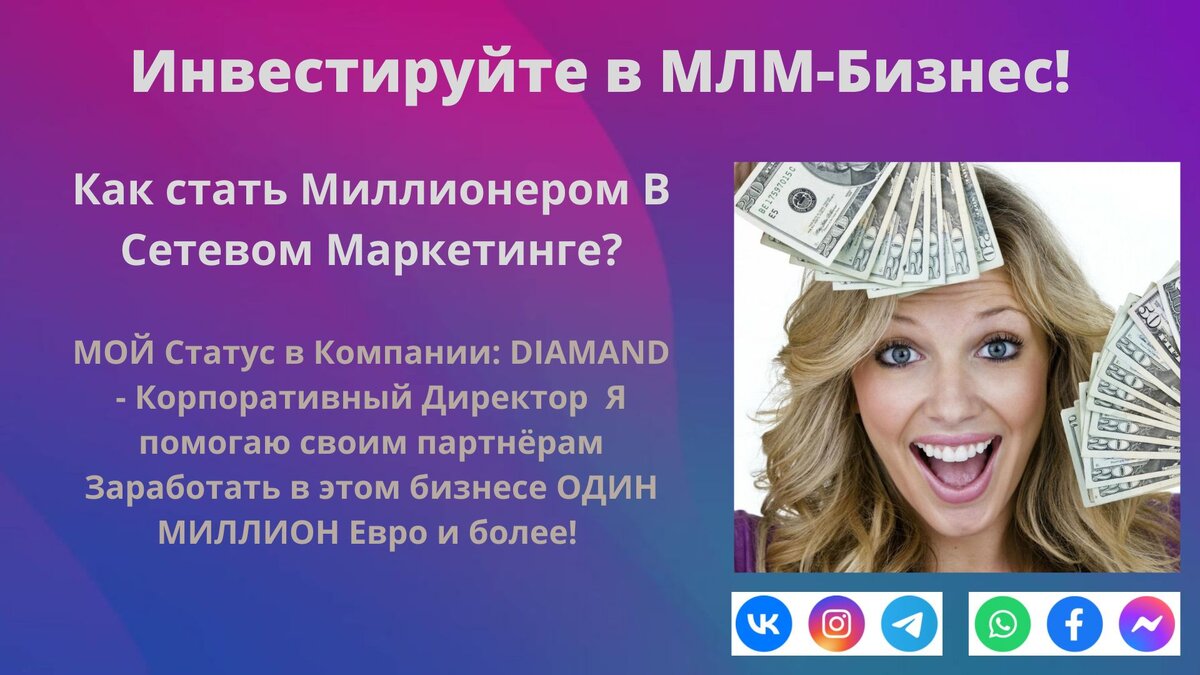 Почему Вам можно доверять мне в МЛМ-Бизнесе! С сетевым Маркетингом я знаком много лет назад. Были хорошие результаты, но при определённых обстоятельствах связанных со здоровьем, я на 8 лет оставил свою деятельность и завершил свою карьеру. Но совсем недавно, я вновь стал активным участником, в одной из самой перспективной производственной МЛМ-компании. Сегодня я в этой компании имею Статус: DIAMAND - Корпоративный Директор и помогаю своим партнёрам добиваться хороших результатов в этом бизнесе! Уважаемые друзья, если Вы мой прямой партнёр или планируете стать таковым в млм-Бизнесе онлайн, то хочу вам сказать, что я приложу все усилия, чтобы научить вас, и на практике показать, как заработать миллионные состояния и стать реальным миллионером в сетевом маркетинге. Сначала я предложу вам готовую концепцию и для этого хочу поделиться с вами тремя шагами, которые принесли мне очень хорошие деньги в сетевом маркетинге и уже в ближайшее время мною будет заработан мой первый миллион евро, о ч