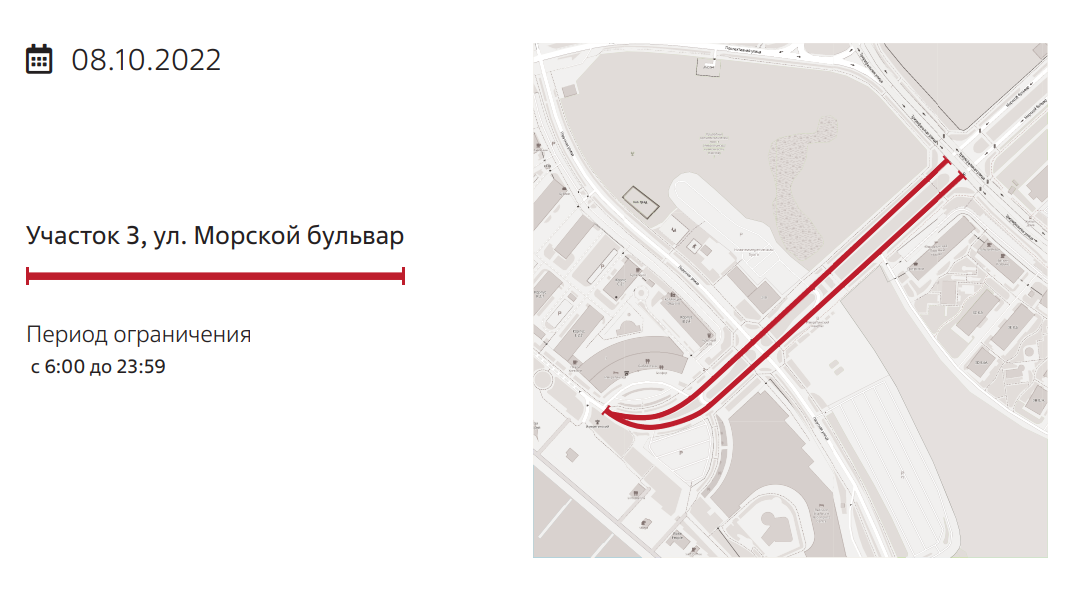 8 октября 2022 года в период с 06.00 часов до 15.00 часов улица Триумфальная от проспекта Олимпийского до КПП гоночного комплекса «Сочи Автодром» трассы «Формула 1».