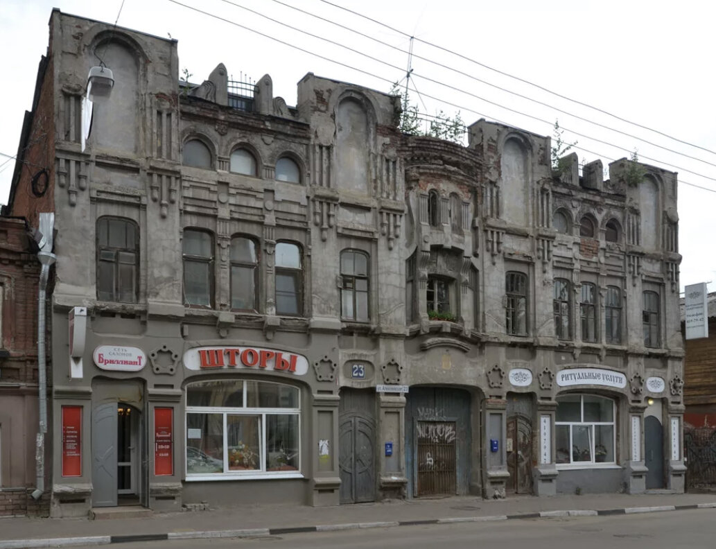 Дом Прядилова был размещен в ряду брандмауэрной застройки на красной линии улицы Алексеевской. Здание прямоугольное в плане построено из кирпича, оштукатурено, имеет два этажа с мансардой и сводчатые подвалы. В решении уличного фасада были обильно применены формы вошедшего тогда в моду модерна. Четко выделена центральная часть главного фасада делит его плоскость на две одинаковые половины. Изначально по центральной оси была расположена проездная арка во внутренний двор. В настоящее время она зашита. Над аркой расположены три окна сложной формы и пара узких полуциркулярных мансардных окон. На первом этаже располагались торговые помещения, поэтому в каждой из одинаковых половин фасада установлено по одному витражному окну с эллиптическими перемычками. По обеим сторонам от окон расположены двупольные двери с полуциркулярными дверными проемами и фрамугами. Каждый дверной проем по бокам обрамлен лопатками. Межэтажное пространство занято декоративными элементами причудливой формы - овалы д