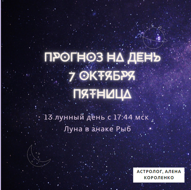 🌏 7 октября, пятница 🌛 13 лунный день с 17:44 мск Растущая Луна Рыбах Друзья, всех с пятницей. День творческий, интуитивный, насыщенный на эмоции, мы более чутки, ранимы и слезки где-то рядом). Занимайтесь творчеством и благотворительностью, лучше если это будет именно реальная помощь руками. Максимально погрузитесь в творческую, креативную атмосферу. Больше находитесь на свежем воздухе, гуляйте в парке, у водоемов. Встречайтесь с друзьями и креативьте, придумывайте идеи, созерцайте. Сегодня повышена интуиция. В дни на Луне в Рыбах с аспектом на Нептун всегда смотрите сны, могут приходить знаки, идеи. Вечером устройте романтик, вино, сериальчик, хорошо если мелодрама, где можно порыдать и выпустить эмоции, обниматься и нежиться с партнером, набрать пенную ванну и релакснуть под свечи и мантры. Под вечер, начиная с 19:18 могут возникать вспышки агрессии и конфликтности, раздражительности, повышена конфликтность. Переносите эту агрессию и «чесотку»поругаться в д
