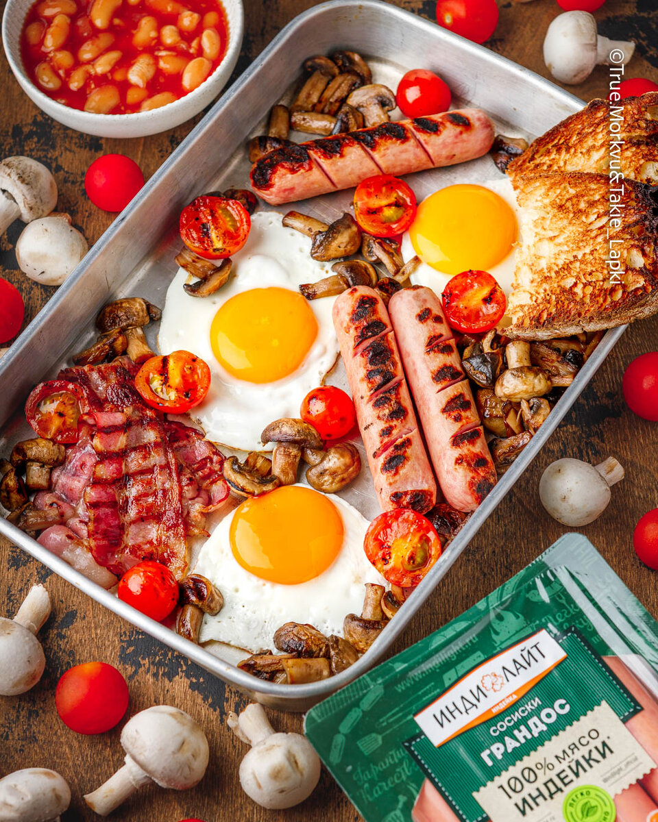 Почти английский завтрачек. В деревне Гадюкино наступил сезон дождей, МЧС присылает истерические смс - в таком-то районе возможем смерч, а вот тут выйдут реки из берегов, сидите дома, глупые человеки. А мы что? Мы сидим, робко выглядываем в окошко и слушаем шум дождя, редко прерываемый криками петухов. Вы прослушали сводку погоды с юга страны. Море, кстати, аж 24 градуса. А как у вас? Дождь, снег, иные погодные явления? Вся эта осень вызывает желание приготовить по-настоящему сытный и плотный завтрачек, например полный английский. Как по мне, это самый лучший вариант для осенней утренней трапезы выходного дня. Для нашего завтрачка мы выбрали сосисоны от Индилайт. Возможно, вы скажете, что странно брать подобные изделия из индейки. Отнюдь, возражу вам. Лично я не ем сосиски из свинтуса, мой организм протестует против них. Поэтому выбор пал на индейку. Не знаю как объяснить, но у них есть текстура и понятно, что ты жуешь продукт из мяса, а не биомассу. Ну а легкая подкопченность придает