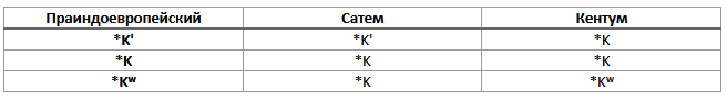 Как видно из этой таблички все языки изменяются одинаково, упрощая сложную трехрядную систему в двухрядную, но по своему, в кентумных языках палатовелярные совпали с велярными, в сатемных языках лабиовелярные совпали с велярными. Никто из них не сохраняет древнее состояние и не является более архаичным или более инновационным. С типологической точки зрения переход лабиовелярных в обычные велярные типологически обоснованно и является совершенно обычным делом, лабиовелярные вообще неустойчивый ряд, а переход палатовелярных в обычные велярные является типологически необоснованным (маргинальным), данный ряд является очень устойчивым, и такое происходит обычно из-за воздействия иноязычного субстрата который не умеет выговаривать мягкие согласные.