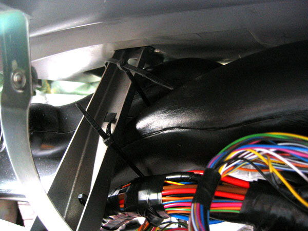 2. Подлечить их совсем просто - хомутами-стяжками (В кронштейне есть квадратные просечки - скорее всего они для родного крепления воздуховодов). Кроме того, на моем экземпляре не был вставлен на место хомут крепления проводки, который на фото справа. Вот, может эта идея кому-то пригодиться. Думаю, это лучше чем губки подкладывать или т.п. Фото - это если смотреть снизу вверх через люк монтажного блока. Там видно - стяжка, что справа на фото стягивает вместе оба воздуховода, после чего они сразу становятся практически неподвижными. Можно добавить ещё одну (на фото она слева) - она притягивает оба воздуховода к какому-то металлическому усилителю. Теперь они на ощупь неподвижны. Если только применить силу, можно немного их пошевелить.