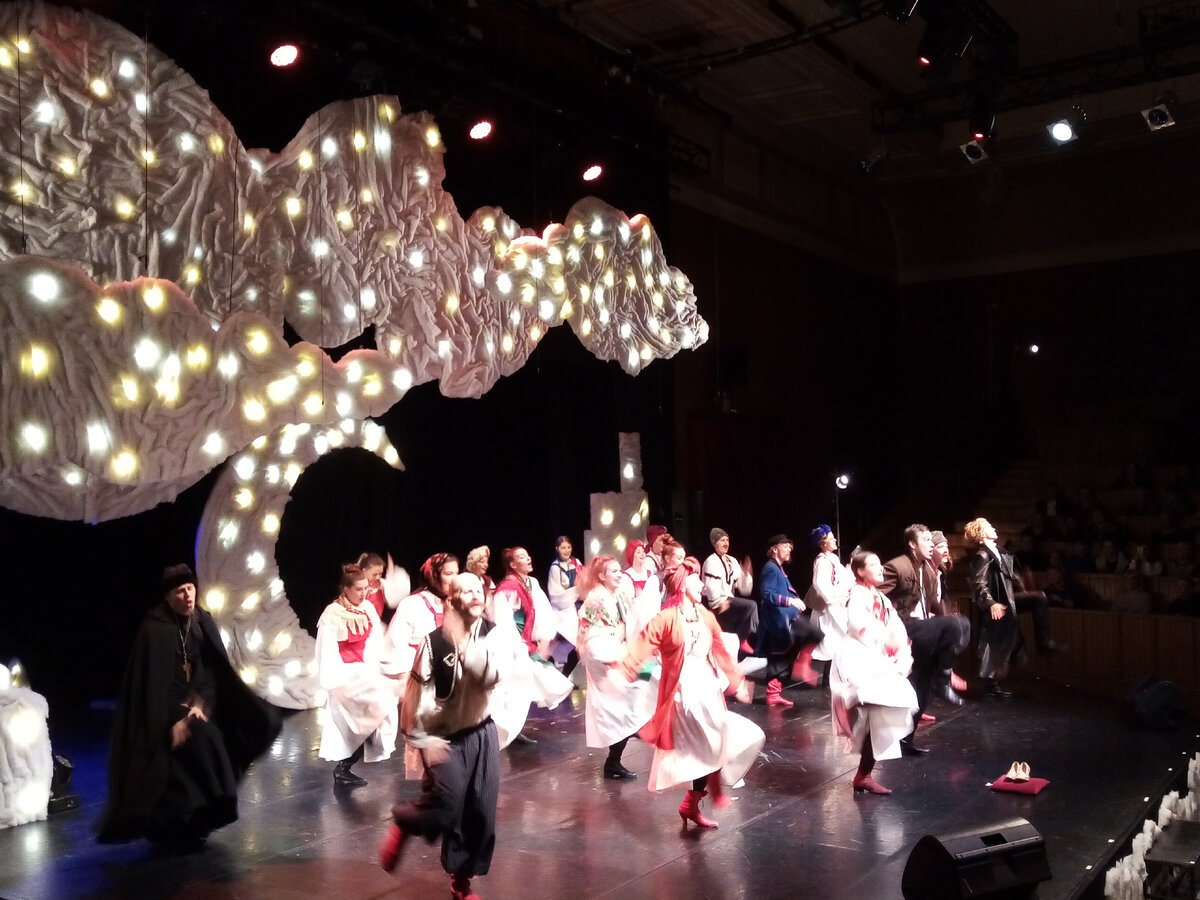 23 и 24 сентября в Учебном театре на Моховой прошла премьера музыкального спектакля "Ночь перед Рождеством", поставленного силами студентов мастерской А.Б. Исакова. Я очень люблю это произведение Н.В. Гоголя, потому, не раздумывая, пригласила подругу сходить на спектакль. Сразу скажу, что в этой постановке великолепно абсолютно все: атмосфера, декорации, костюмы, музыкальный материал, световое оформление и, безусловно, артисты. С первых минут складывается ощущение, что ты находишься не в учебном, а профессиональном театре. Сначала взгляд цепляют декорации, а когда выключается свет и на сцену выходят артисты... Обычно в спектакле всегда есть один-два человека, которых ты выделяешь для себя больше остальных, даже если тебе понравился весь спектакль. Так вот, в данной постановке выделить кого-то одного невозможно, здесь прекрасны абсолютно все: и парочка казаков-пьяниц, и набожный дьяк, и ведьма Солоха, и Чуб, и Черт, и главные герои Вакула с Оксаной, и все остальные. Все персонажи -