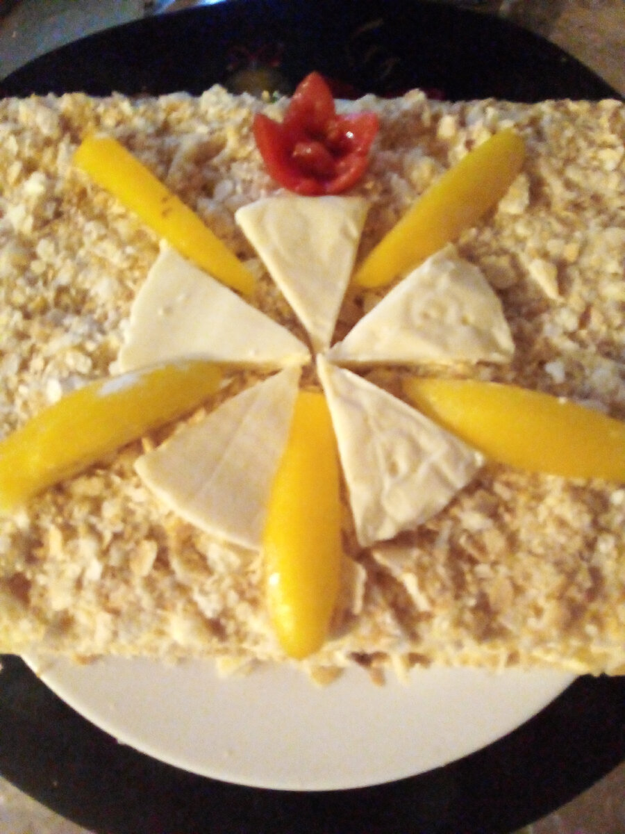 Иногда, хочется приготовить что- то новенькое, вкусное, и при этом, затратить минимум времени. В таком случае выручают закусочные пироги. При чём, начинка может быть разная: сладкая и не сладкая. У меня не сладкая))))) Понадобится: коржи для торта Наполеон. А также- майонез, варёные яйца, сыр, лук и баночка рыбных консервов в масле, у меня была скумбрия в масле, но лучше, конечно, горбуша! Собираем пирог, коржей в упаковке 5 , черыре на пирог и последний- измельчить и использовать, как посыпку. Слои такие: корж смазать майонезом, размять рыбку в консервах и добавить мелко нарезанный репчатый лук, сверху- натёртое на крупной тёрке яйцо и следующий слой- натёртый сыр и так три коржа, четвёртый- смазать майонезом , посыпать раскрошенным коржиком и украсить! После этого надо дать ему отстояться и пропитаться! Получается вкусно, сытно, быстро и красиво! Если начинка сладкая, то я обычно, использую сгущённое молоко и размягчённое сливочное масло. Надо всё взбить и можно также намазывать корж