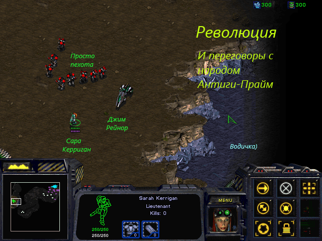 Наверно, вам уже надоела эта однообразная статья, так что расскажу кратко. Я накопил армию стелсов, грифов, морпехов, огнемётчиков и высадил всё это возле вражеской базы. Также я привёз Рейнора и Керриган.