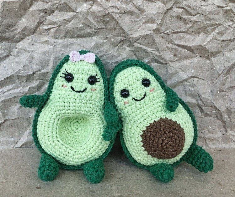 Добродушные Авокадинка и Авокадик придутся по душе не только любителям фрукта авокадо, но и всем, кто любит милашности. Вязаные малыши авокадо станут прекрасным подарком для влюбленной пары или лучших друзей, детям они также полюбятся. Размер игрушек на фото — 11 см. Автор — LeftHandedCrochet Перевод с исправлениями и дополнениями — Marijn V. из Unicorn’s Handmade Источник: vk.com/club166074371 Схема вязания фрукта авокадо крючком Условные обозначения: сбн — столбик без накида сс — соединительный столбик пр — прибавка уб — убавка ПСП — вязание за переднюю стенку петли ( только в том ряду, где написано ПСП) ЗСП — вязание за заднюю стенку петли ( только в том ряду, где написано ЗСП) 1 вариант Передняя часть (с косточкой) Начинаем коричневым цветом: 1р. 5сбн в КА 2р. 5 пр (10) 3р. (1 пр, 1 сбн) х 5 (15) 4р. (1 пр, 2 сбн) х 5 (20) 5р. (1 пр, 3 сбн) х 5 (25) 6-7р. 25 сбн Меняем цвет на светло-зелёный: 8р. ПСП (1 пр, 4 сбн) х 5 (30) 9р. (1 пр, 5 сбн) х 5 (35) 10р. (1 пр, 6 сбн) х 5 (40) 11