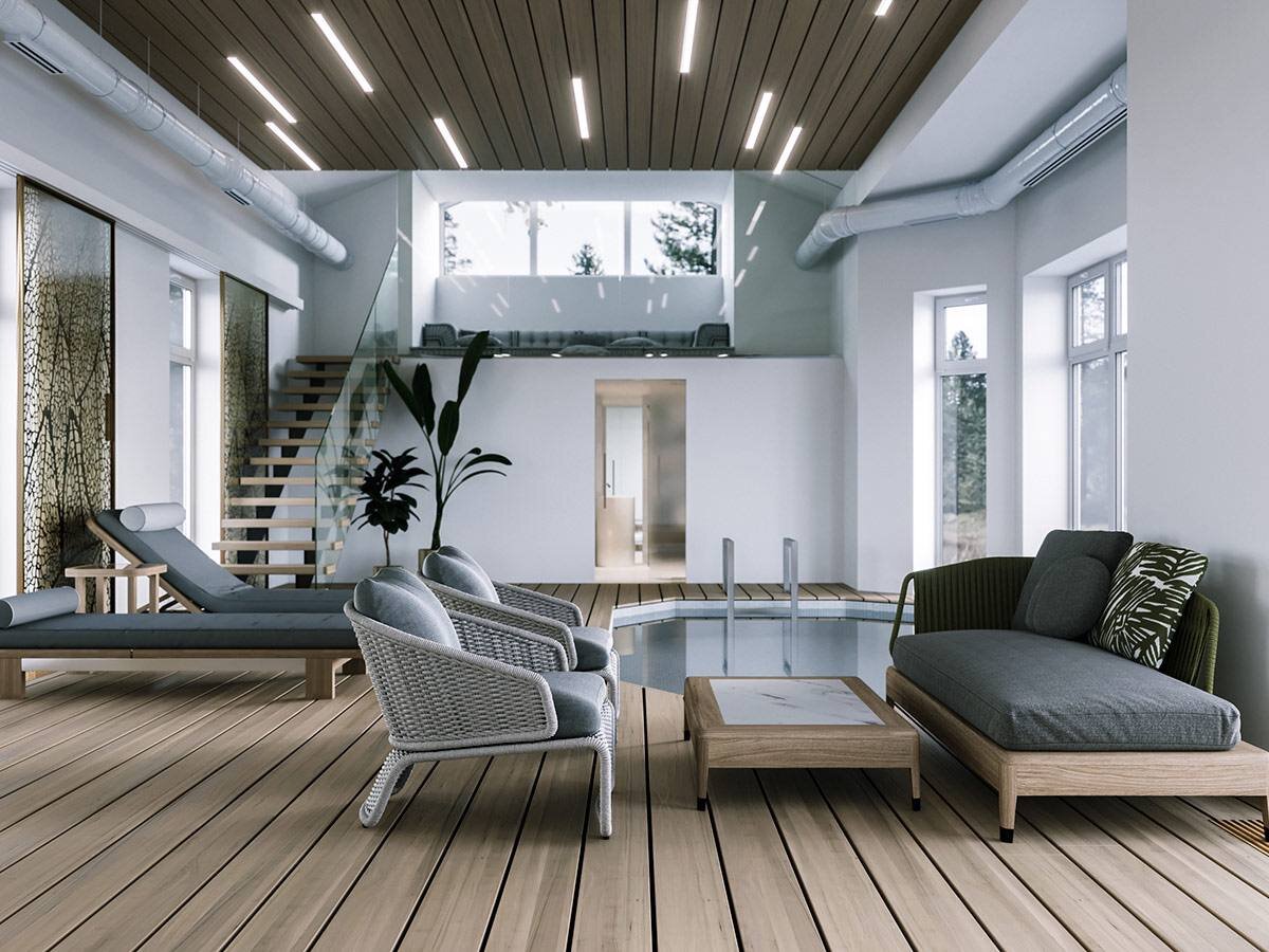 Пример оформления зоны бассейна, с комнатой отдыха и турецкой баней. Комната с бассейном обставлена креслами из ротанга и небольшим журнальным столиком. Небольшой холодильник встроен в стену из белых шкафов, благодаря чему прохладительные напитки всегда будут под рукой. Современные ленточные светильники встроены в деревянный потолок, чтобы сделать всю комнату яркой. Шезлонги расположены у бассейна, где домовладельцы могут расслабиться и полюбоваться загородной местностью за окнами.