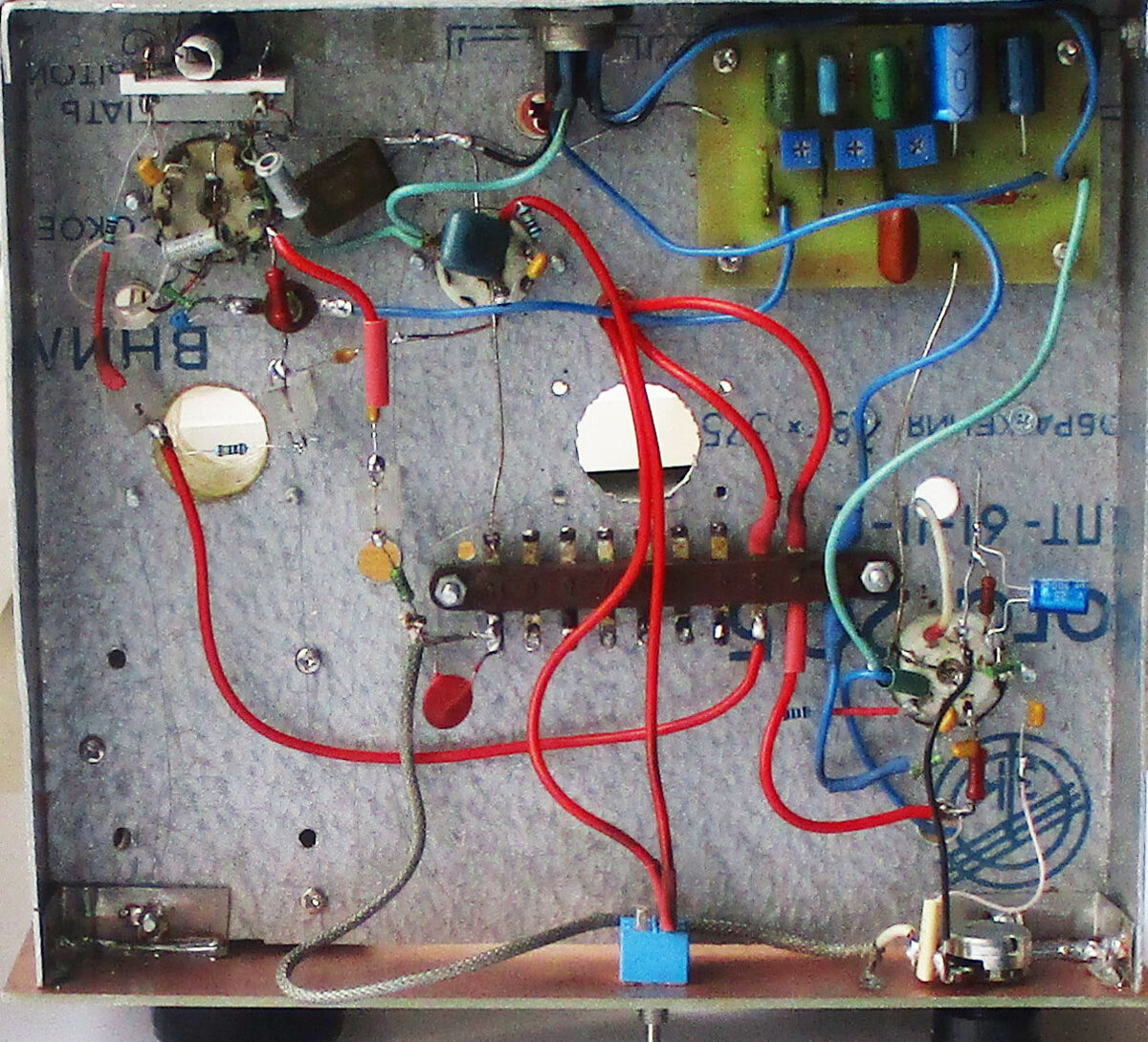 Поэтому в аппаратуре часто используют комбинацию этих способов, когда на шасси крепятся не только навесные элементы, но и печатные платы. Этот способ используем и мы. Ведь в построении фильтров анодного и сеточного питания никаких переделок явно не потребуется, а паразитные емкости там даже полезны. Приемник имеет 2 платы одинакового размера, крепящиеся через одни и те же отверстия. Сверху шасси размещается плата анодного фильтра, а в подвале шасси - плата отрицательных накальных и сеточных напряжений. Остальное же сделаем навесным монтажом.