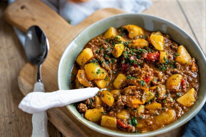 Дома есть блюда, которые я могу готовить каждую неделю, и никто не будет жаловаться. Эта простая и вкусная фермерская сковорода, безусловно, одина из них. Рецепт фермерской сковороды не только очень вкусный, но и удивительно простой в приготовлении. Это определенно стоит попробовать! #фарш #картофель #кухня #кулинария #рагу #блюдо #готовить #готовимдома #едаирецепты #рецепты Время приготовления: 30 мин. Пошаговый рецепт: лучшая фермерская сковорода с мясным фаршем: ШАГ 1: Сначала очистите картофель, помойте и нарежьте кубиками. Перцы помойте, очистите от семян и нарежьте небольшими кубиками. Очистите лук и нарежьте его на мелкие кусочки. ШАГ 2: Разогрейте немного оливкового масла в большой сковороде и обжарьте фарш до образования крошки. Немного поджарьте лук, чеснок и томатную пасту и добавьте красное вино. ШАГ 3: Добавьте паприку, картофельные кубики и потушите. Тем временем добавьте говяжий бульон к картофелю. Добавьте травы и специи и дайте повариться около 20 минут до готовности