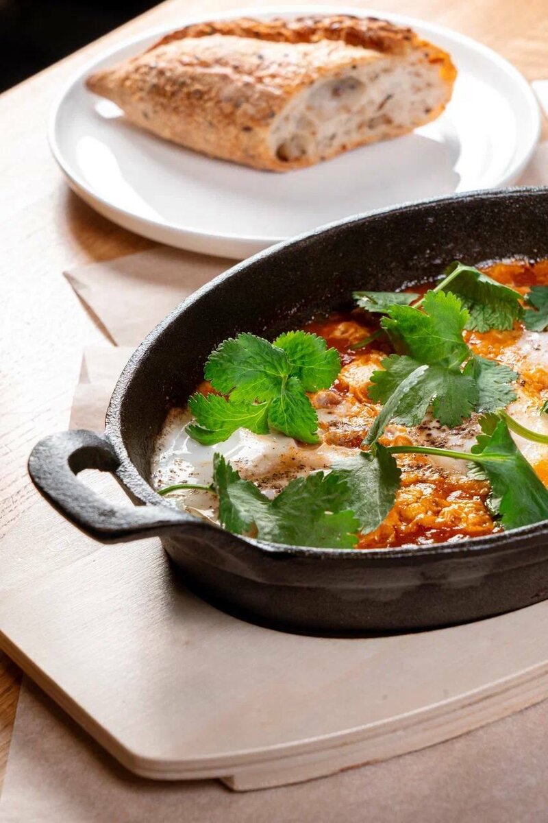 Шакшука – традиционное израильское блюдо, сочетающее в себе смесь полезных ингредиентов из сочных помидоров, сладкого перца, фермерских яиц, лука и свежей зелени.
