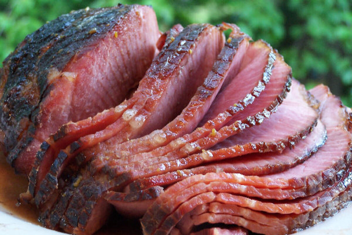Ветчина по-верджински имеет довольно оригинальный вкус и требует некоторое время для ее приготовления. Мы должны ветчину потушить в духовке и приготовить к ней соус. Чтобы это сделать нужно смешать сухую горчицу и сахар, смесь втереть в кусок ветчины, нашпиговать ее гвоздикой. Мясо уложить на сковороду, влить немного воды. Ветчина запекается в духовке при температуре 160 – 180 оС в течение часа. Мясо будет выделять сок, так вот время от времени открывайте духовку и им обливайте мясо. Уложите на ветчину дольки двух груш, запекайте до готовности, следите, чтобы не пригорели. И это довольно оригинально, ведь груши пустят сок, которым пропитается мясо, а поливая ветчину соком, груши также его впитают в себя.Обжарьте кусочки шпика. А в это же время давайте тушим горох в небольшом количестве воды, когда он будет почти готов, смешайте с обжаренным шпиком без жира. А к готовому гороху влейте сливки, добавьте перца, посолите. Ветчину уложите на тарелку, к ней подать горох, жареный картофель,