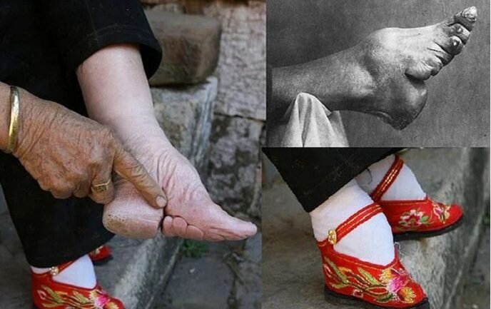 В китайских традициях красивой считалась миниатюрная женская стопа. Бинтование ног началось еще в ХIII веке — 5-летним девочкам туго бинтовали стопы, чтобы нога не увеличивалась в размере. Это приводило к ужасной деформации костей и суставов, многие утрачивали возможность ходить в принципе. Но красота и, как следствие, возможность удачно выйти замуж, были важнее.