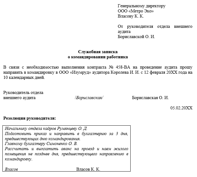 В случае применения служебной записки о направлении сотрудника в командировку порядок ее создания и движения также должен быть отражен в положении о командировках.
