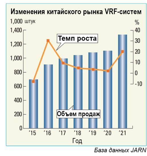 По оценке JARN в 2021 году объем рынка VRF-систем в Китае вырос почти на 20,7 % по сравнению с предыдущим годом, превысив объём в 1,33 млн единиц оборудования, и заняв более половины китайского рынка коммерческих систем кондиционирования воздуха.